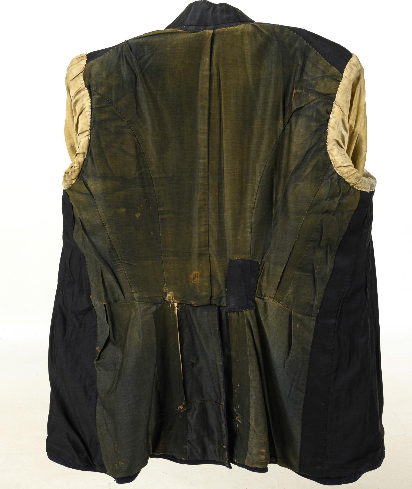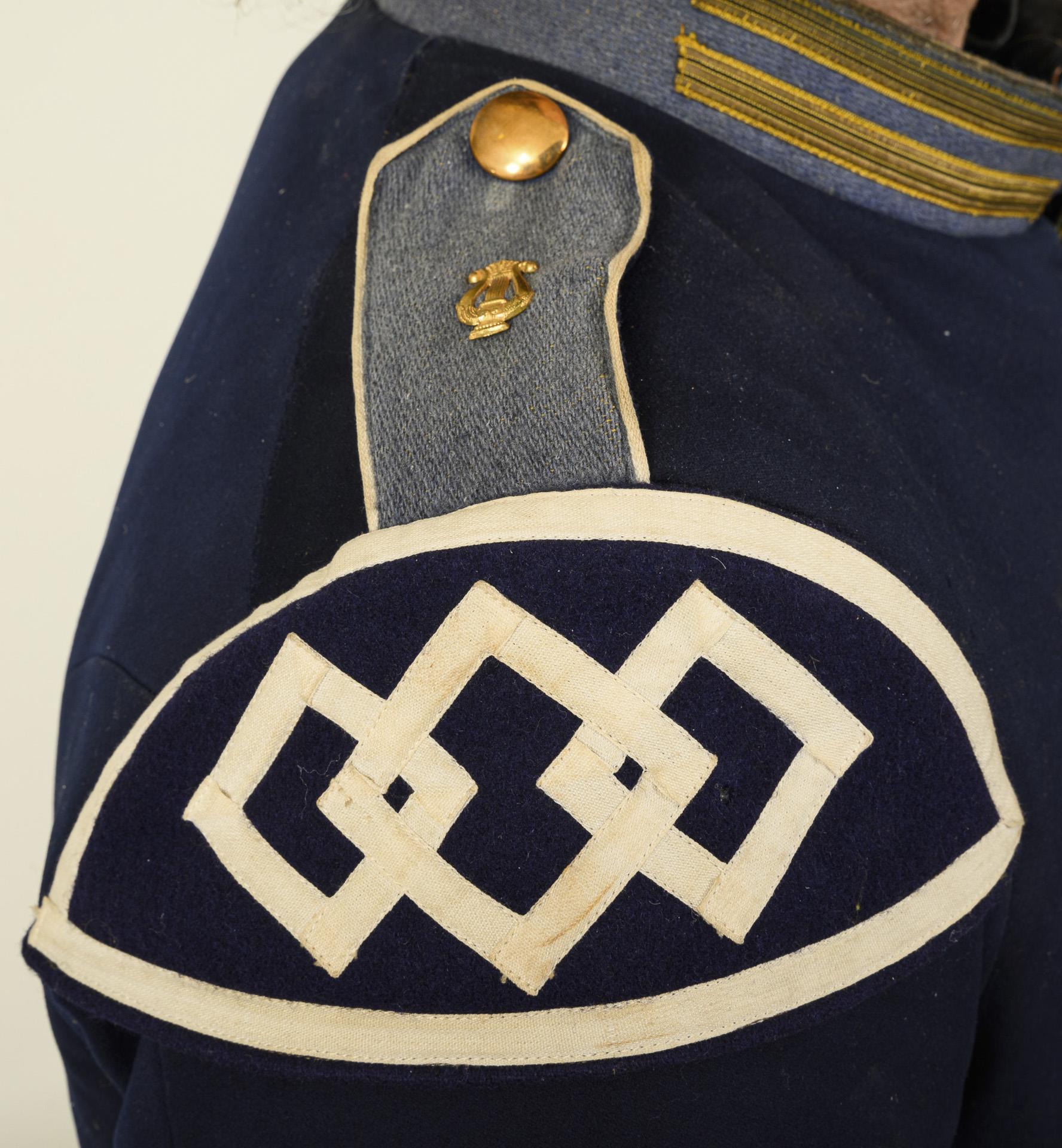 Dark blue uniform from a marching band with appliquéd lyre on the shoulder pieces, diamonds on the swallows' nests and 2 gold braids on the stand-up collar with hook fasteners. Comes with a white belt; on the belt buckle the imperial crown and the inscription "Gott mit uns". Signs of age/use, lining partly torn and patched. Name inscription from Weilburg in the paddock.