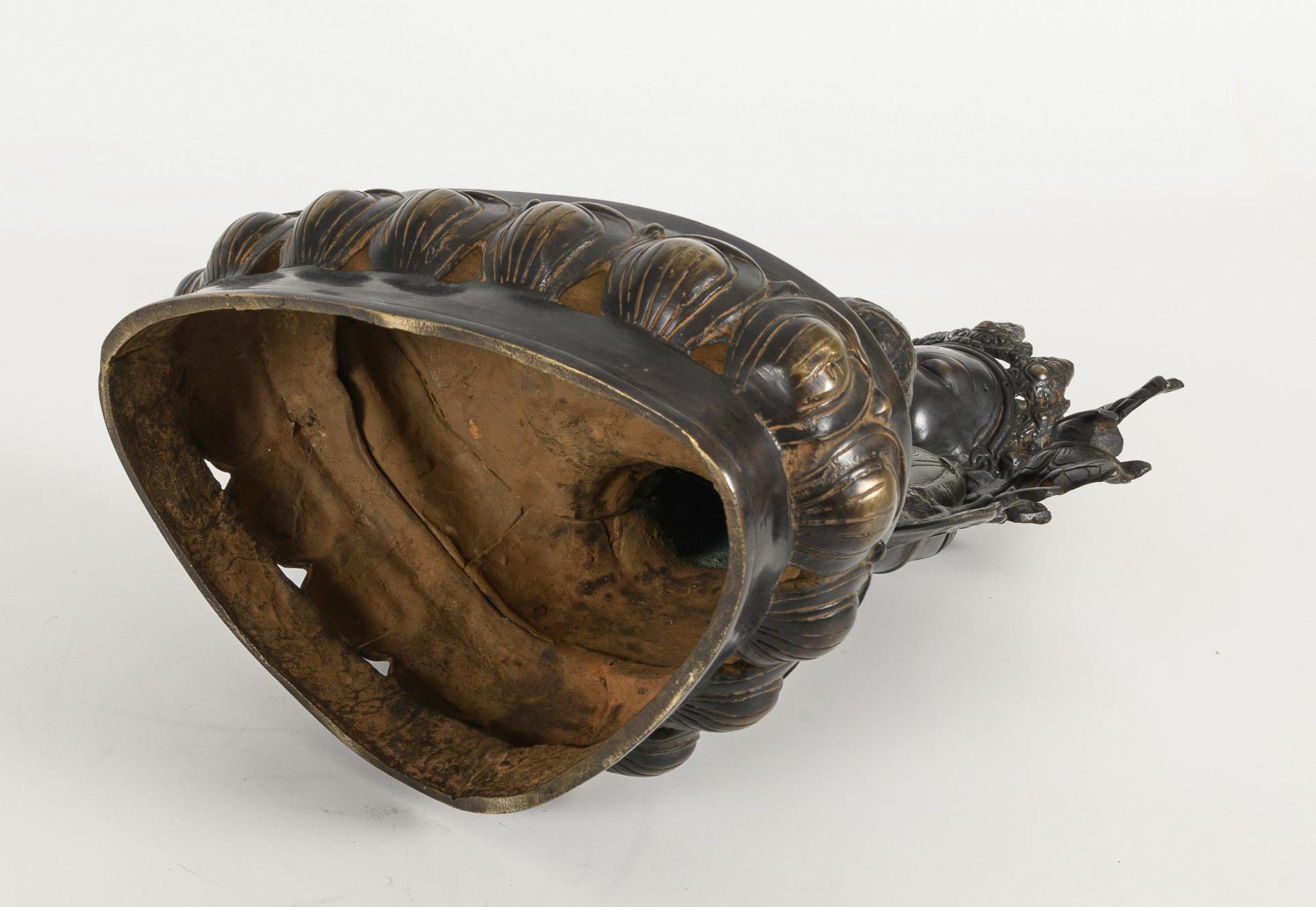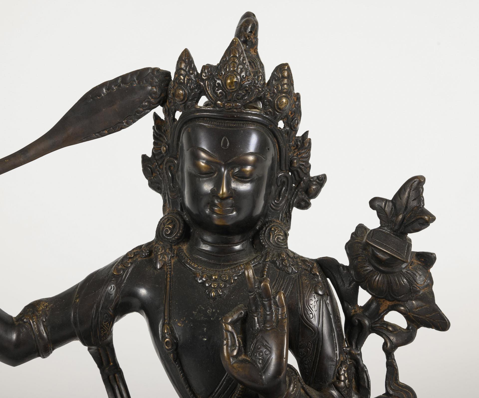Openwork lotus throne, with the bodhisattva seated on it. Sword and book as attributes. Finely engraved clothing and jewelry.