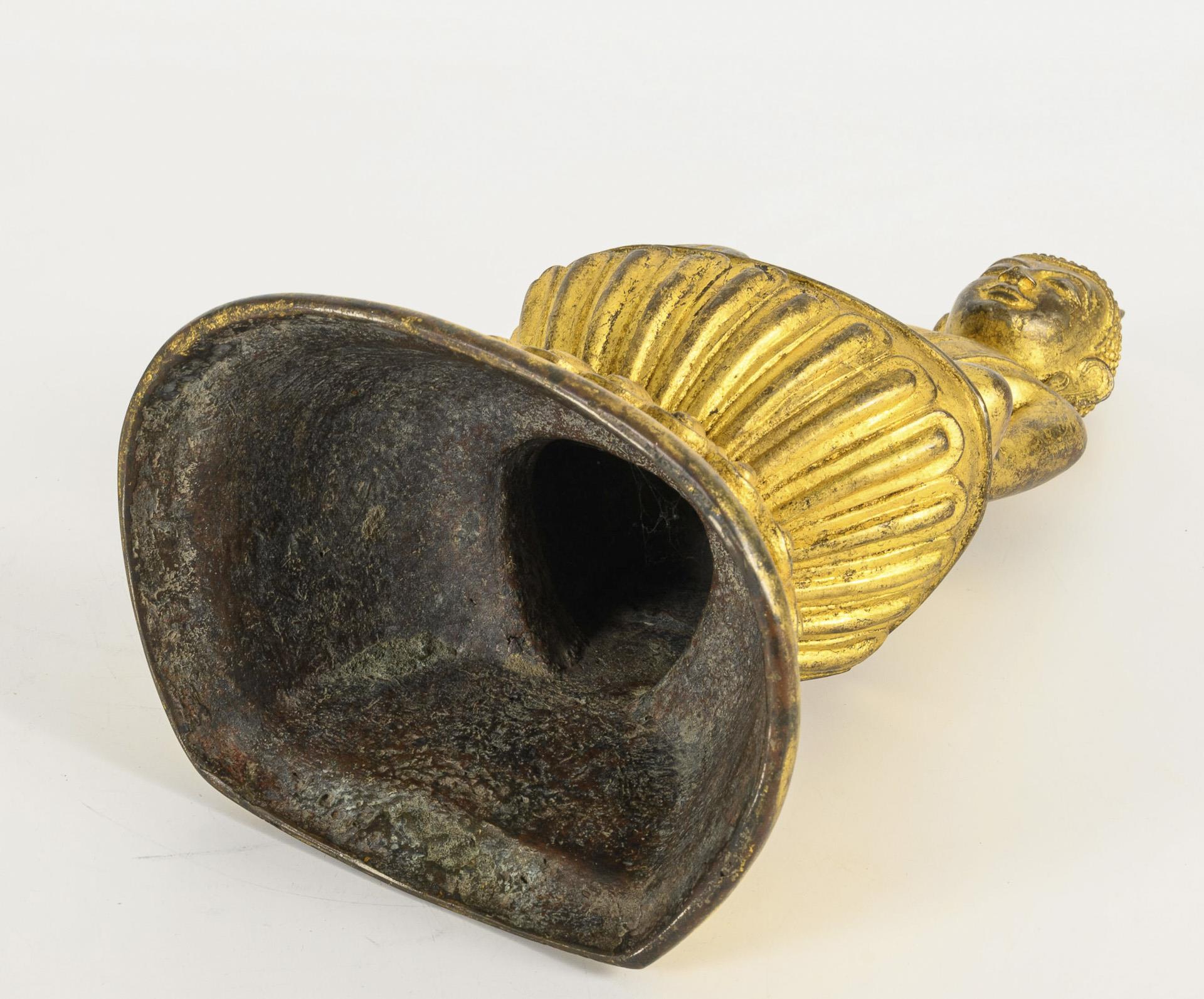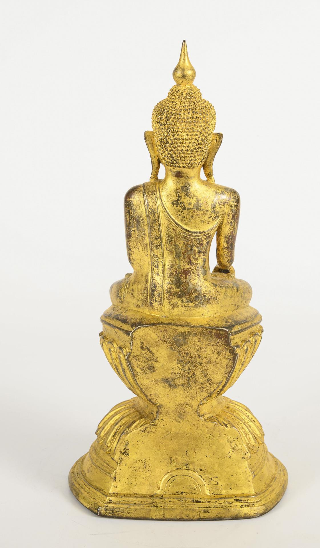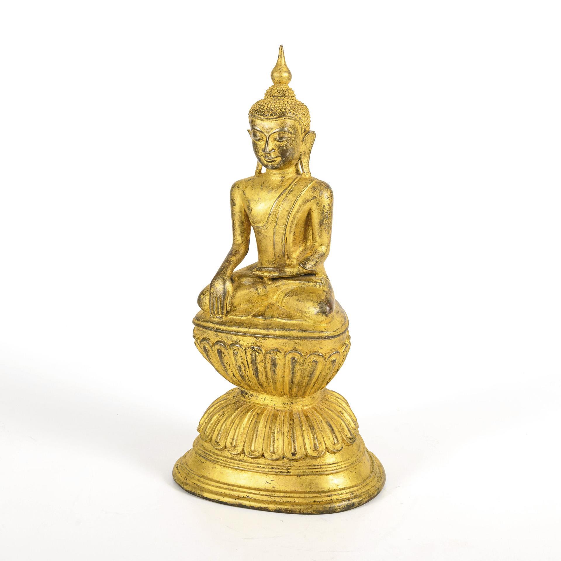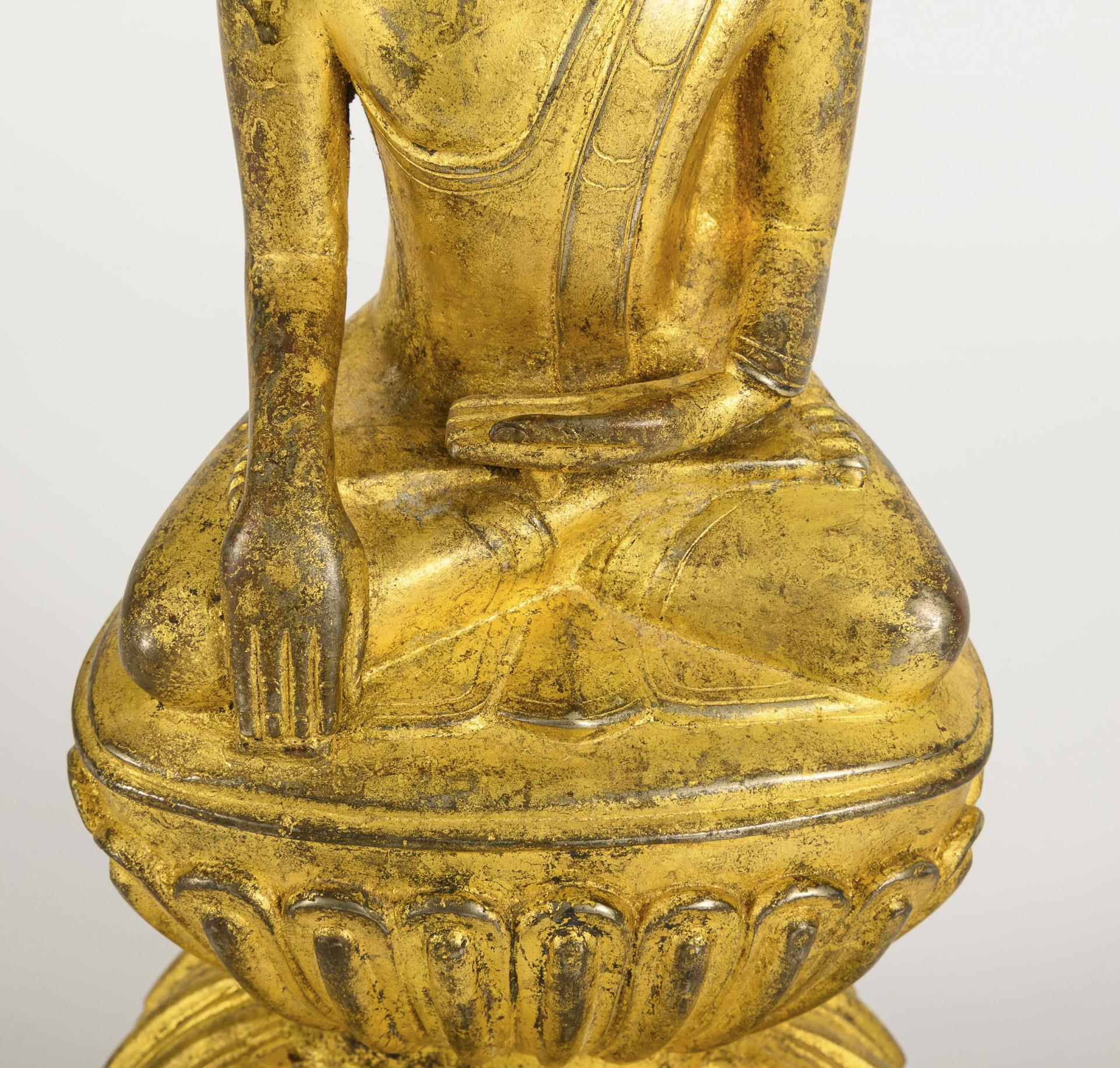 Figure seated on a high, double lotus throne with the gesture of touching the earth. The back of the base hollowed, the inside hollow and cleanly worked. Gold somewhat rubbed.