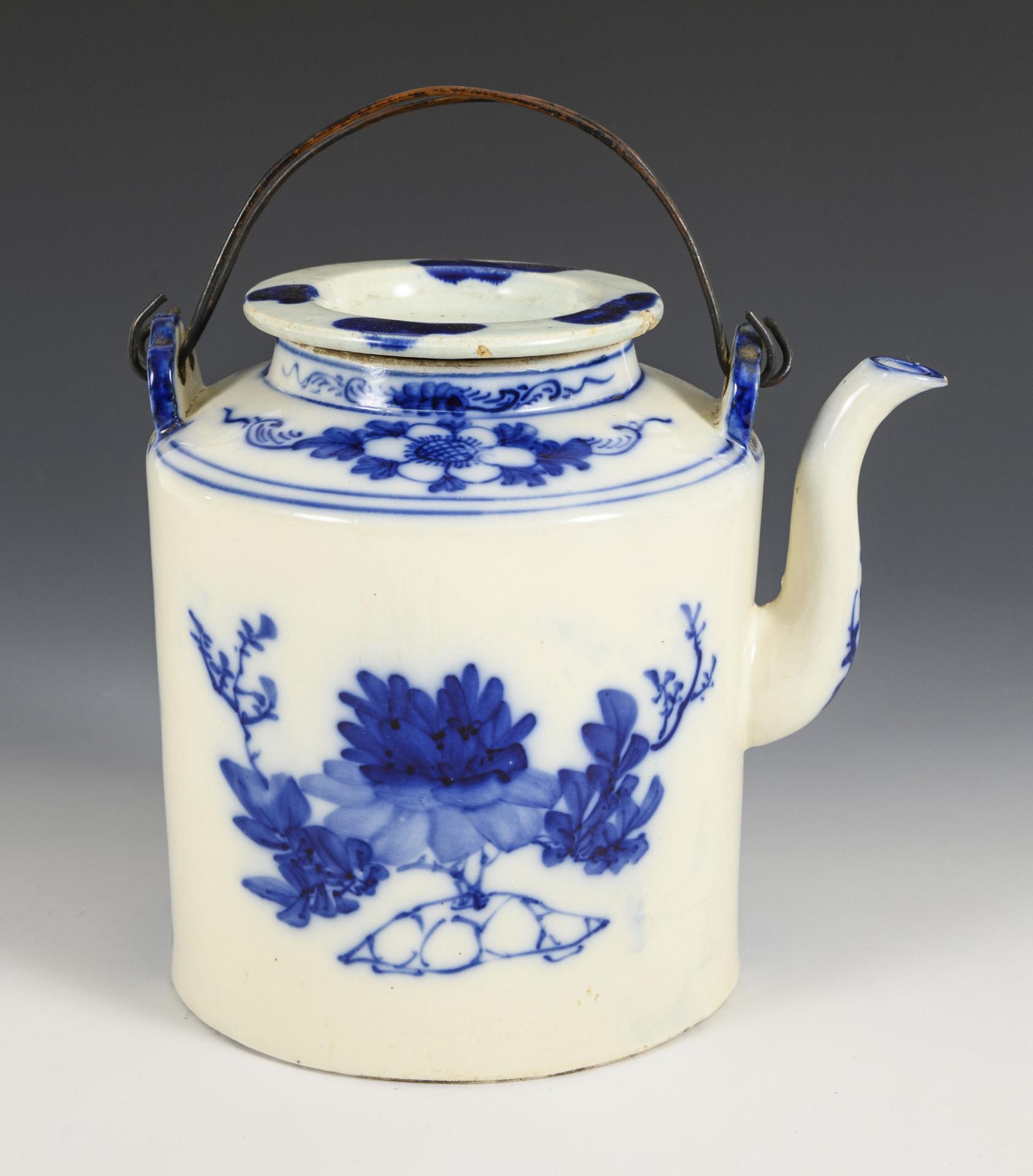 Cylindrical shape with deep-set spout. Heavily stylized figurative scene in a landscape, reverse with peony blossom. Flat plate lid with cloud pattern, two metal handles. Lid and spout with old chip.
