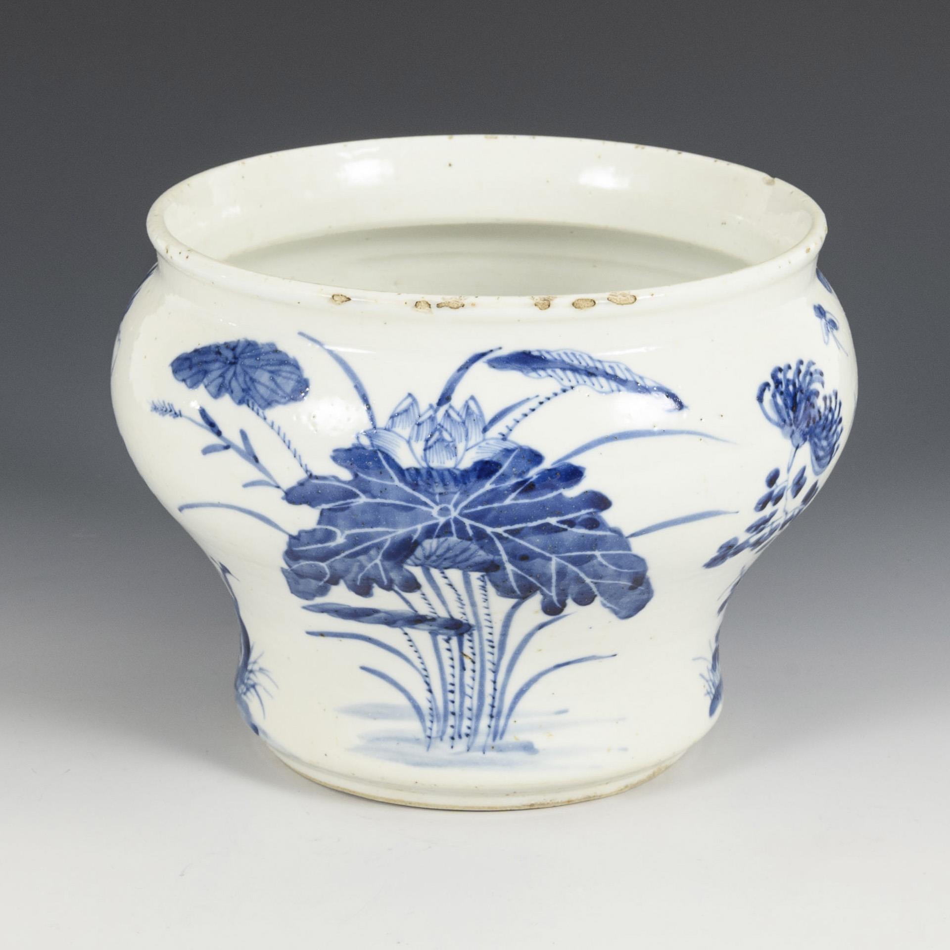 Flared shape towards the top. Prunus, peony, water lily and chrysanthemum on the wall, probably depicting the seasons. Probably an older form. Upper rim with old chips and chipped glaze, glaze 'spider' on the underside.