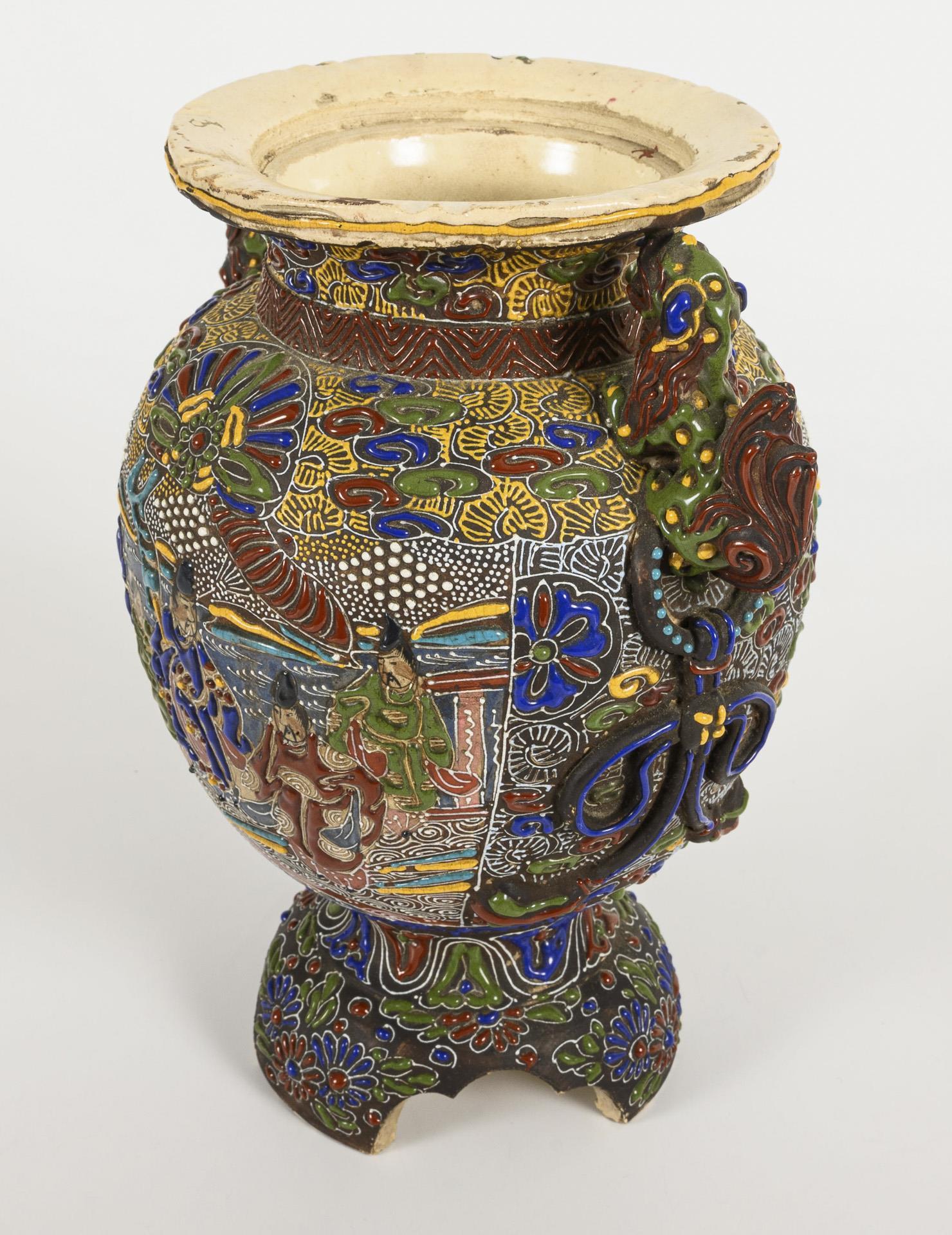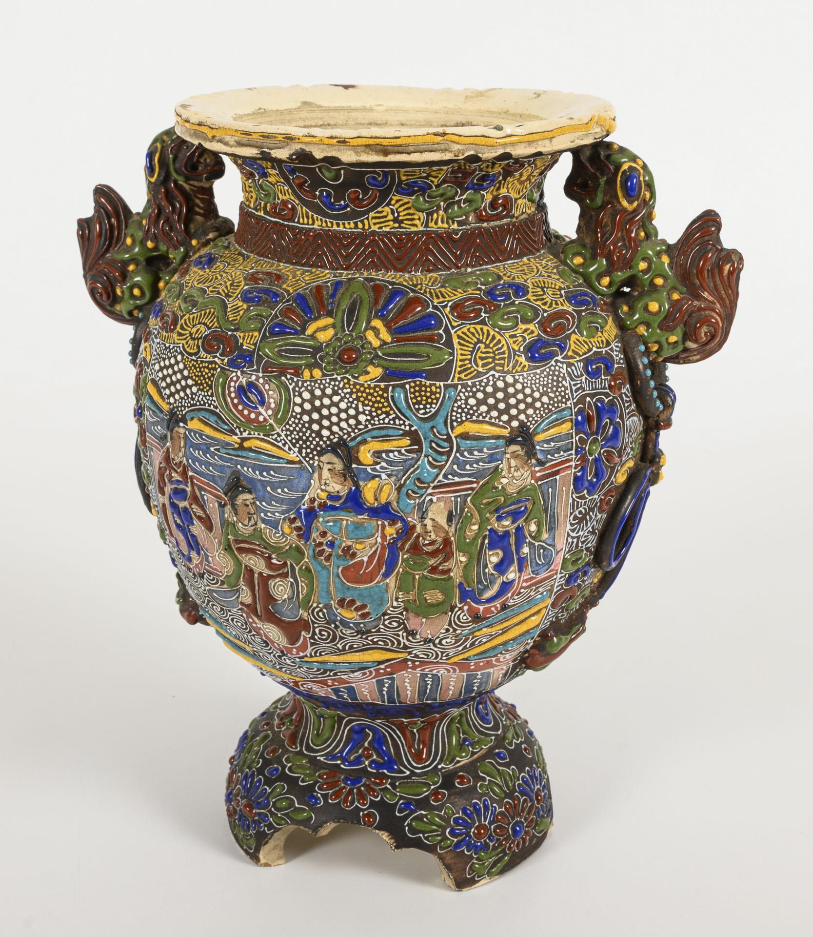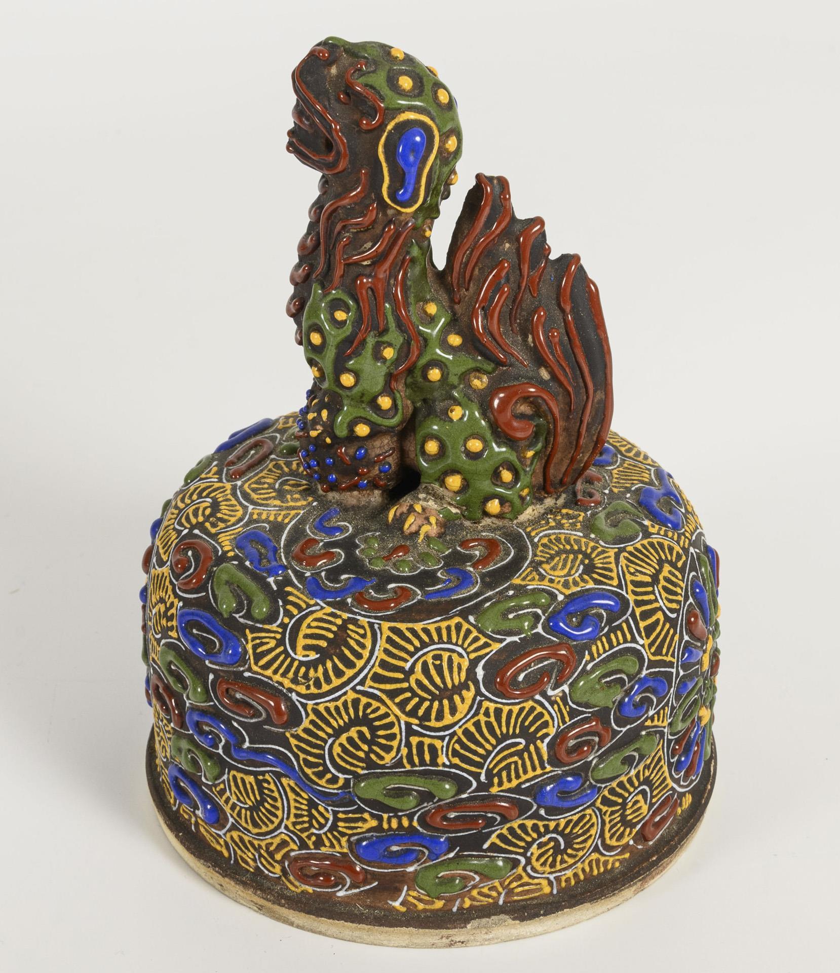 Fully painted with relief enamel painting. Figural scenes and floral patterns. Fo dogs as handles and grips, bow motifs applied to the sides. Red lettering on the lid, inner rim and base. Bottom cracked in the production process, slight signs of use.