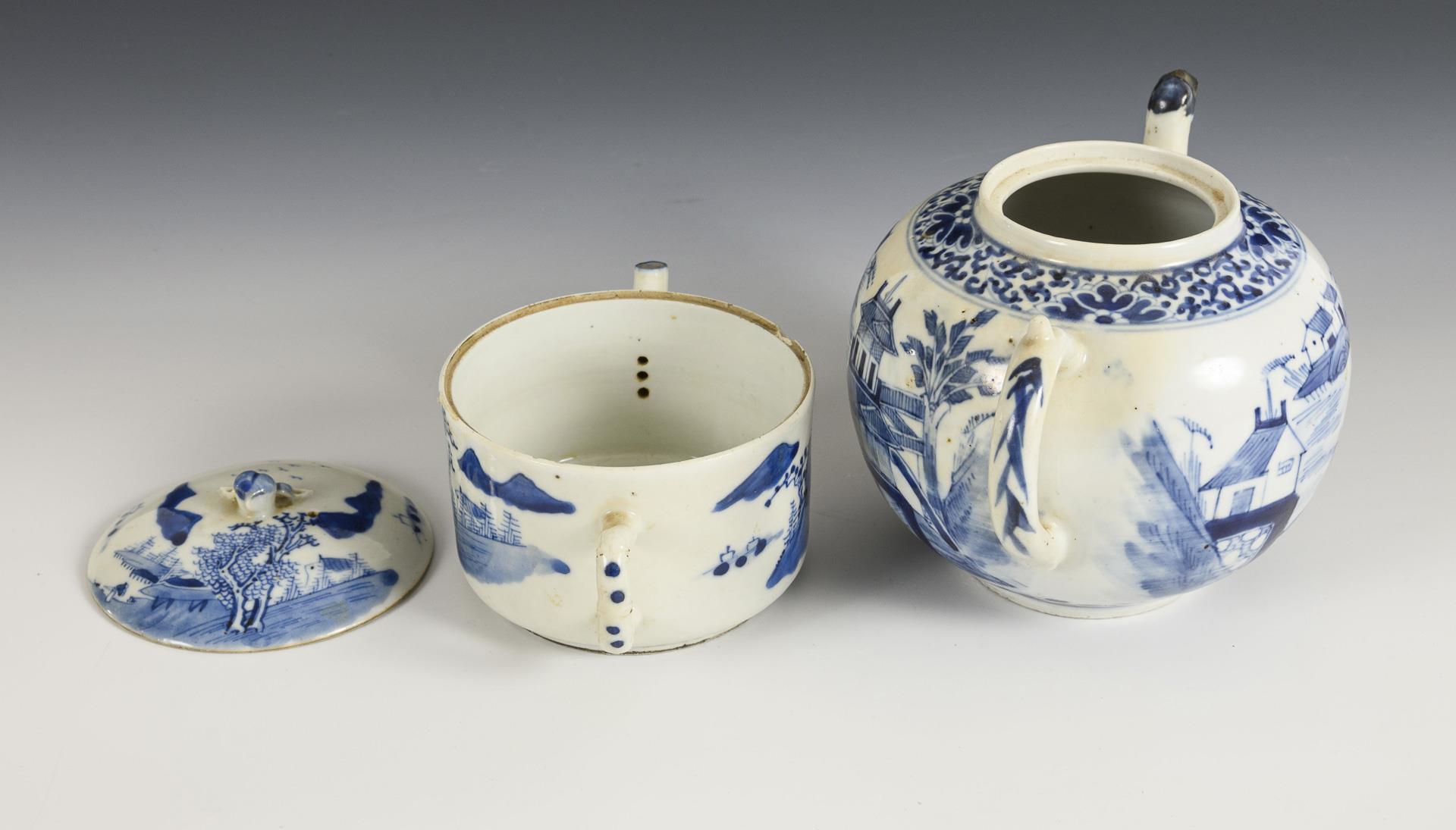 Ball-shaped jug with animal-shaped spout and landscape depiction. Without lid, (h 12 cm). / Small, cylindrical jug. Bamboo-shaped handle, peach-shaped knob. Chip to the upper rim. (H 9 cm).