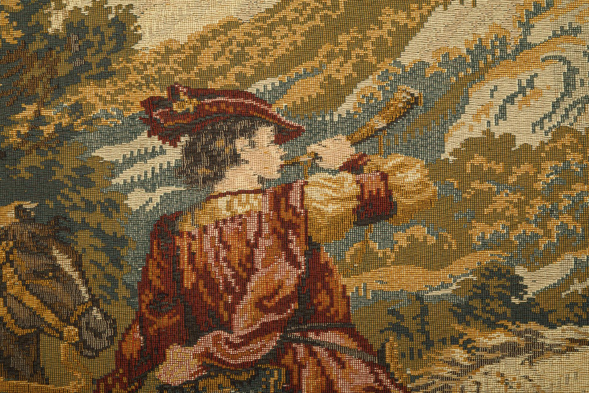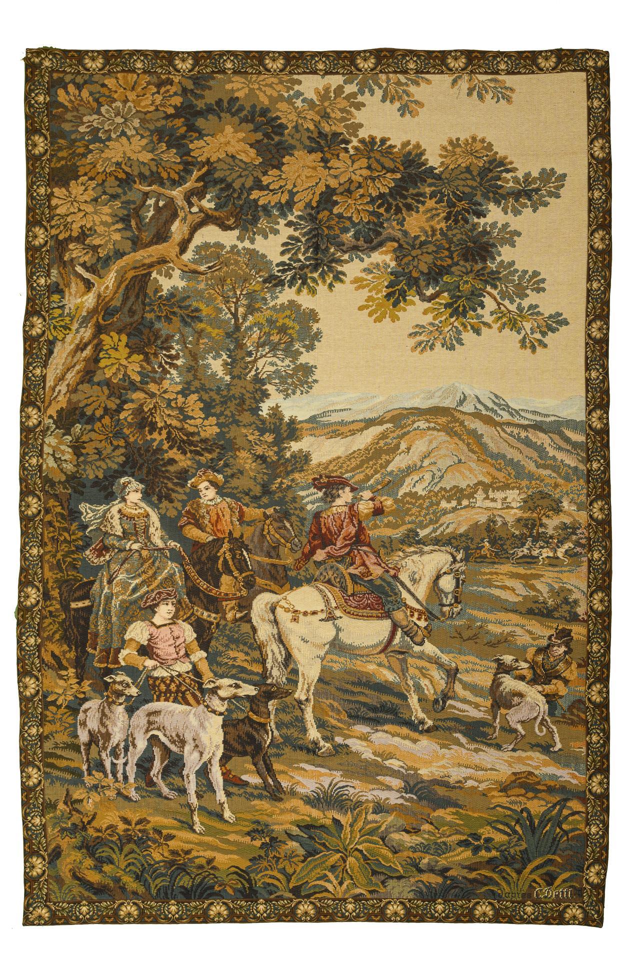 Wall hanging with a wide landscape and historicizing figures hunting. Narrow border strip with floral decoration.