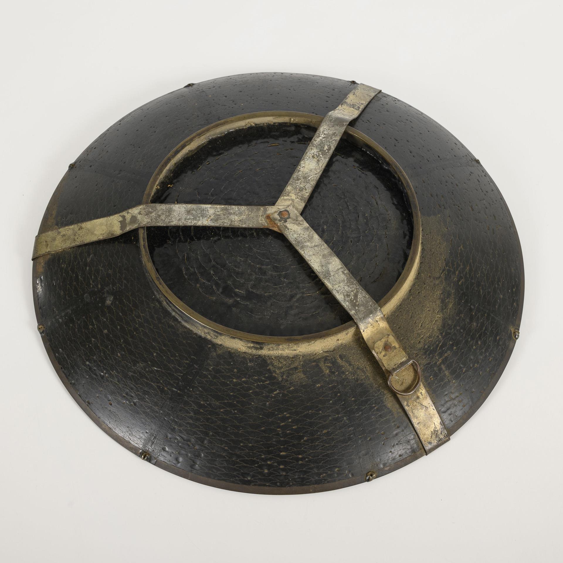 Very fine pattern with white blossom in the center. Black enamel on the reverse, with scale decoration. Wall mount and traces of old wall mount.