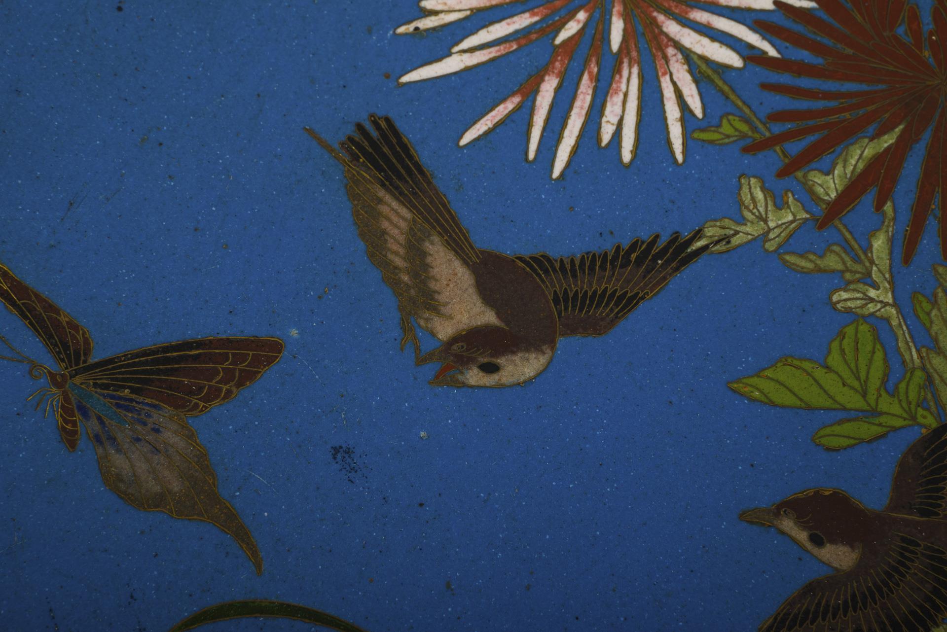 Flying sparrows between chrysanthemum blossoms. Back enameled, with spiral pattern. Smaller scratches to the front, larger repair to the back.