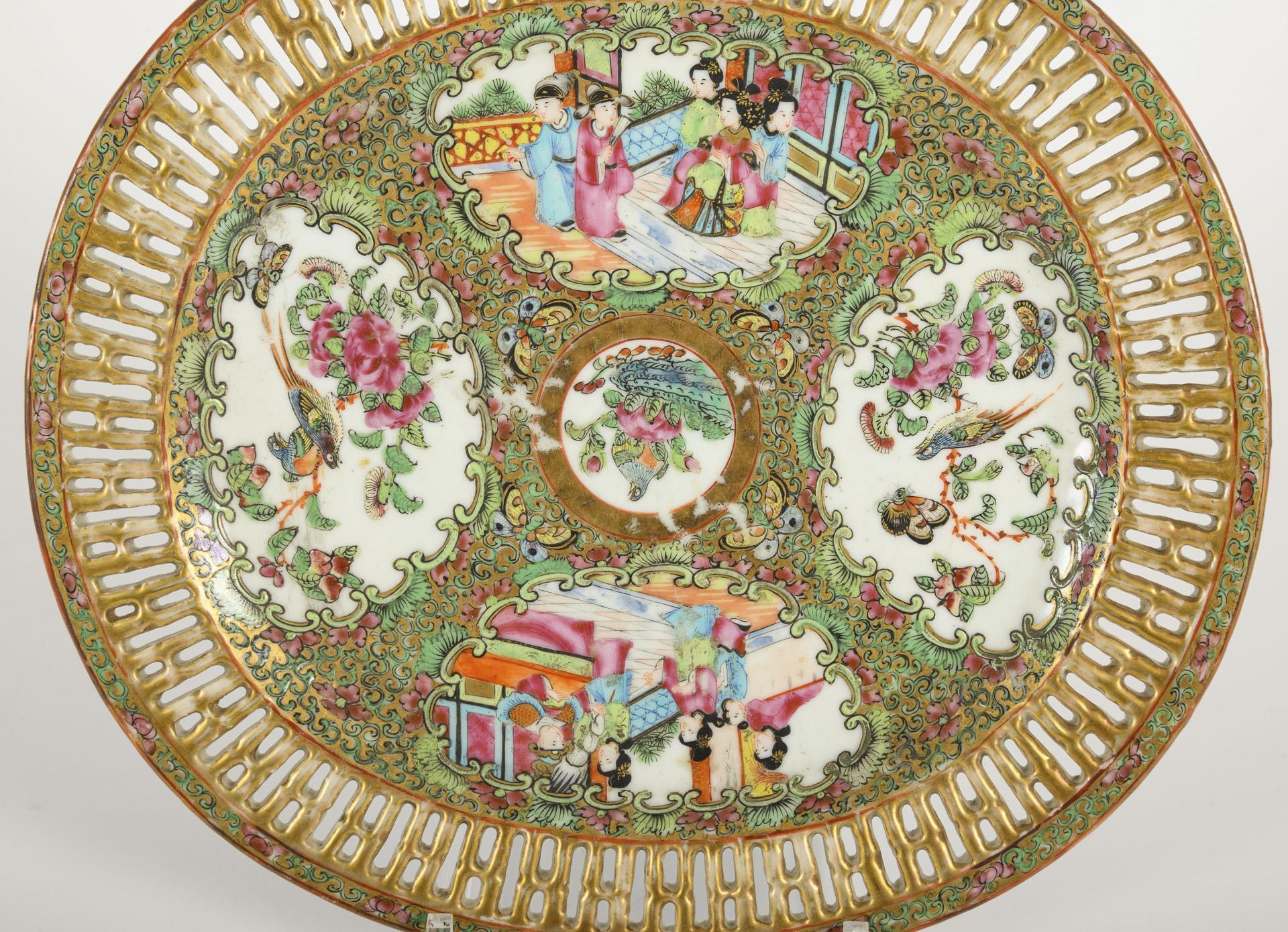 Flat form with cartouches between delicate tendrils. Polychrome painting with gold rim. Painting rubbed, small glaze defects.