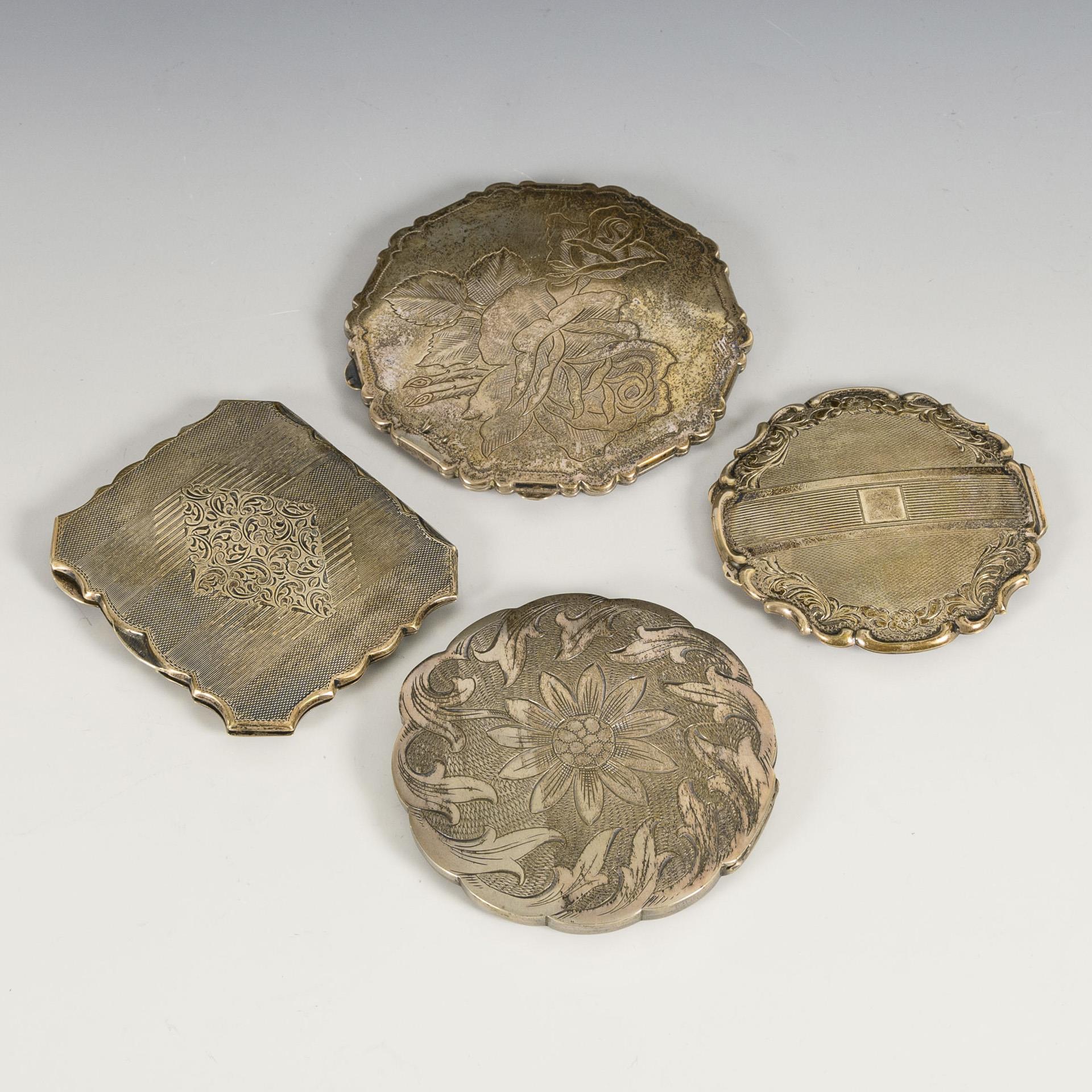 Finely engraved and guilloché, all with inner mirror. 3x round, 1x rectangular. Signs of wear, 2x with powder residue.