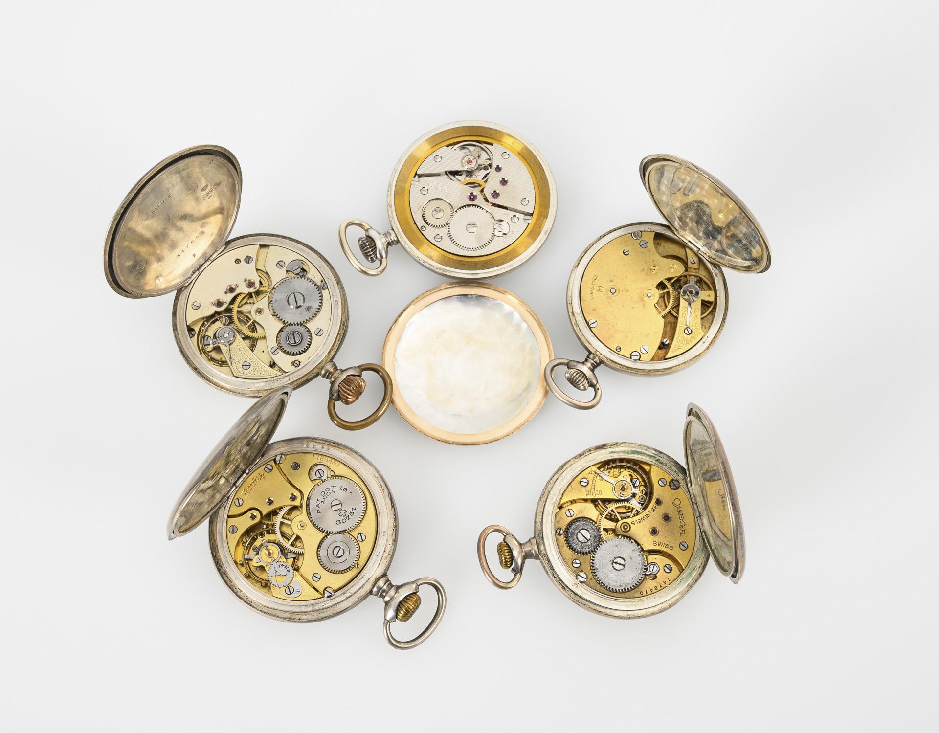 Each hallmarked silver, predominantly with Swiss hallmark, company mark and case no. Ø 4.7 to 5 cm. Total weight 381 g.