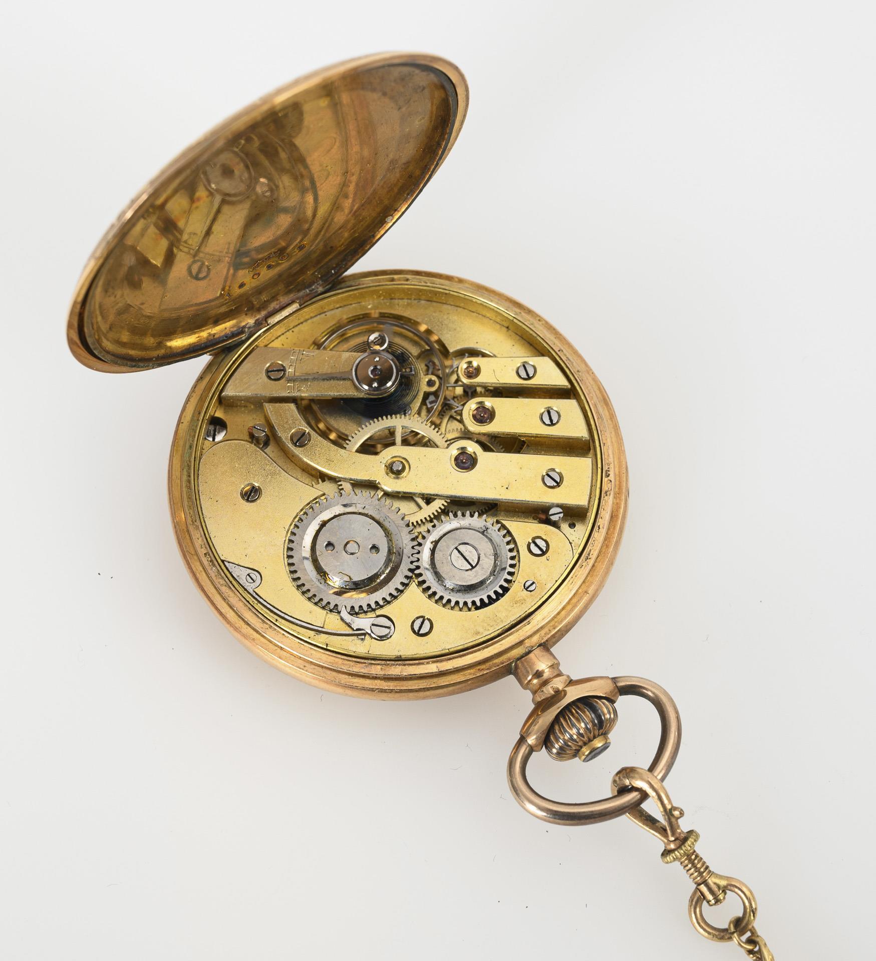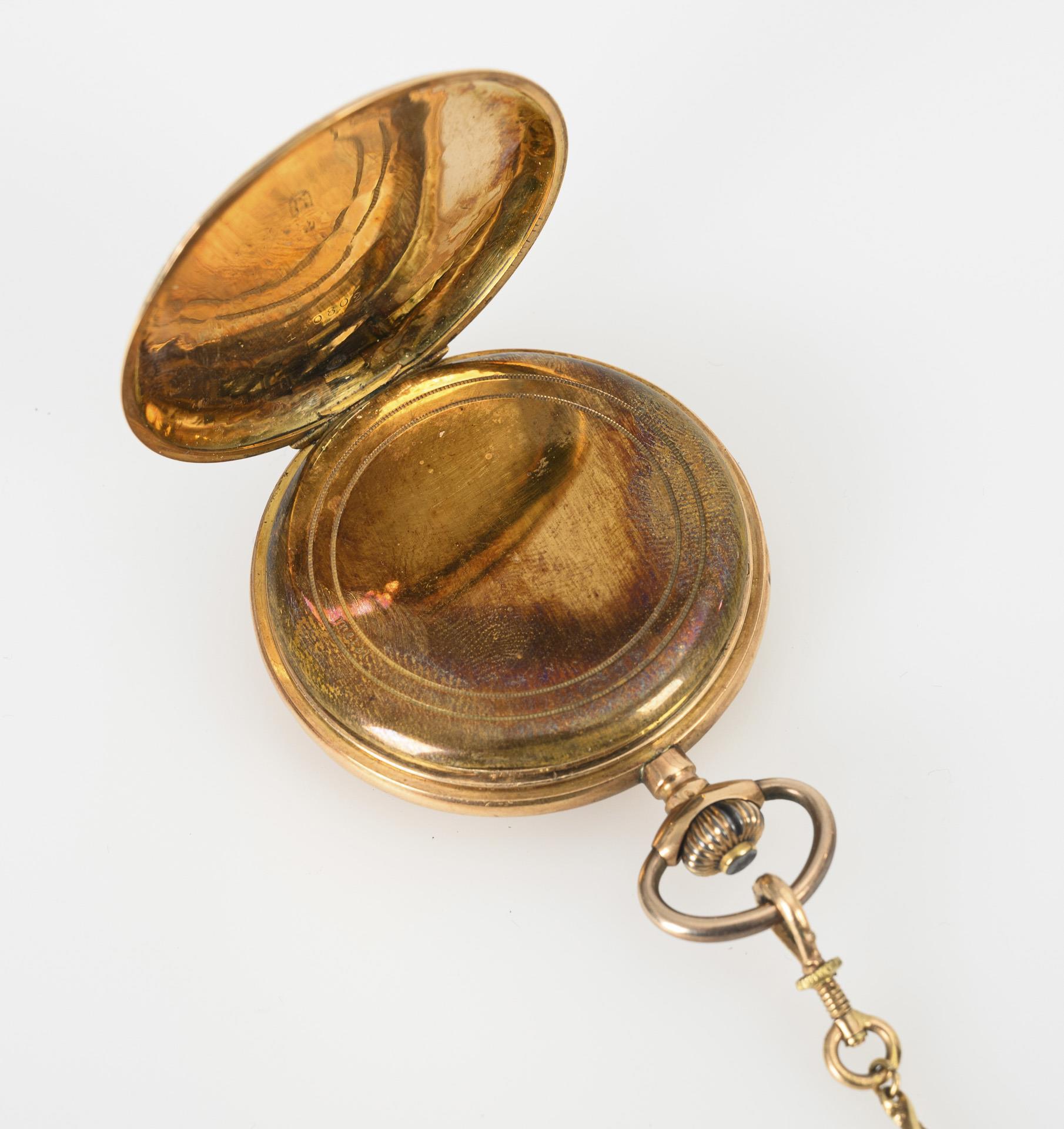 Florally engraved sprung cover case with empty coat of arms reserve, metal dust cover. On a gilt watch chain with diagonally twisted decorative links, screw-in carabiner and round hook as well as 2 gilt historicism medallions. Case dented, dial glass missing, dial slightly hairline cracked.