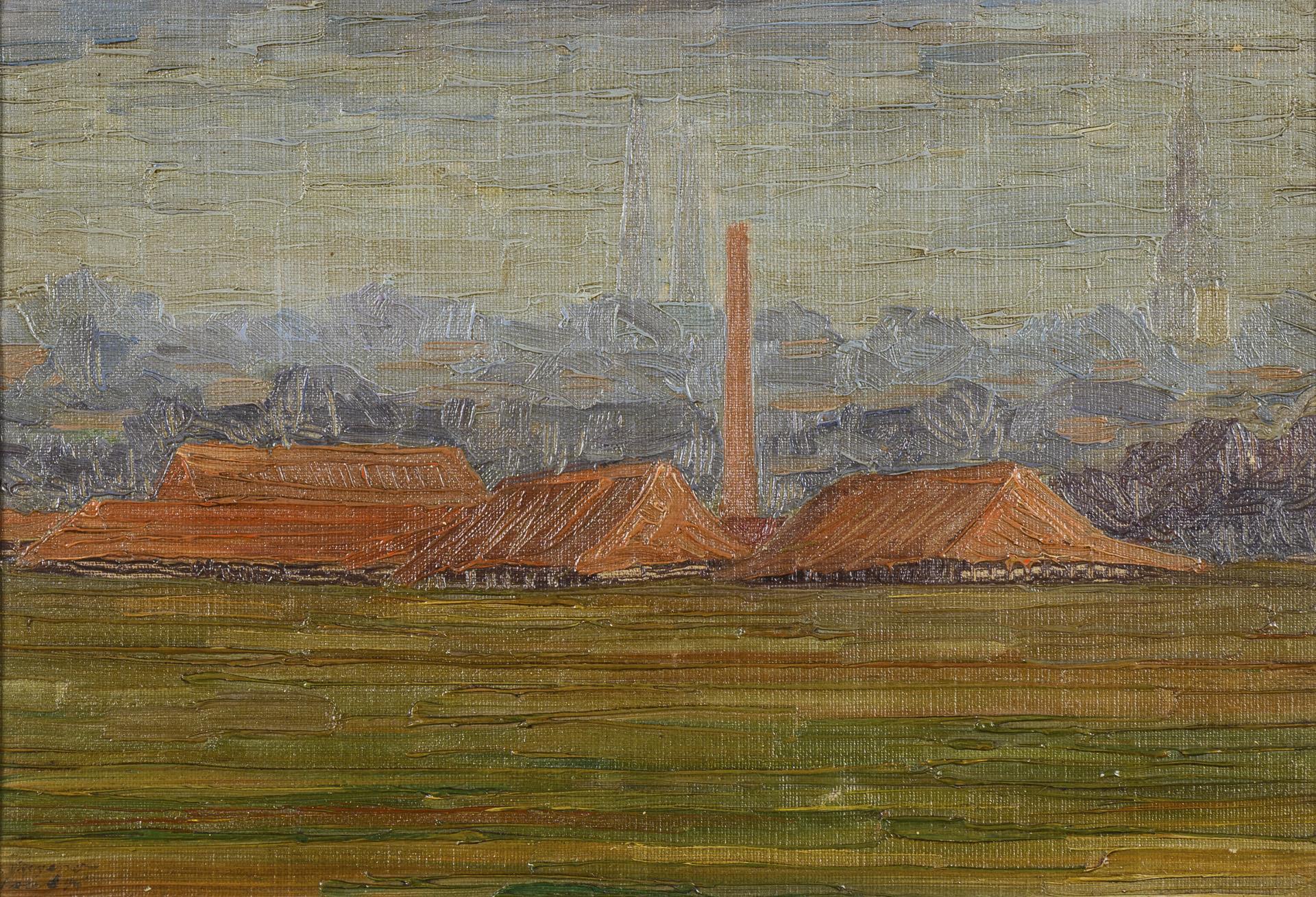 Small landscape sketch with a view of a factory site in a wide, flat landscape. Minimal traces of age.