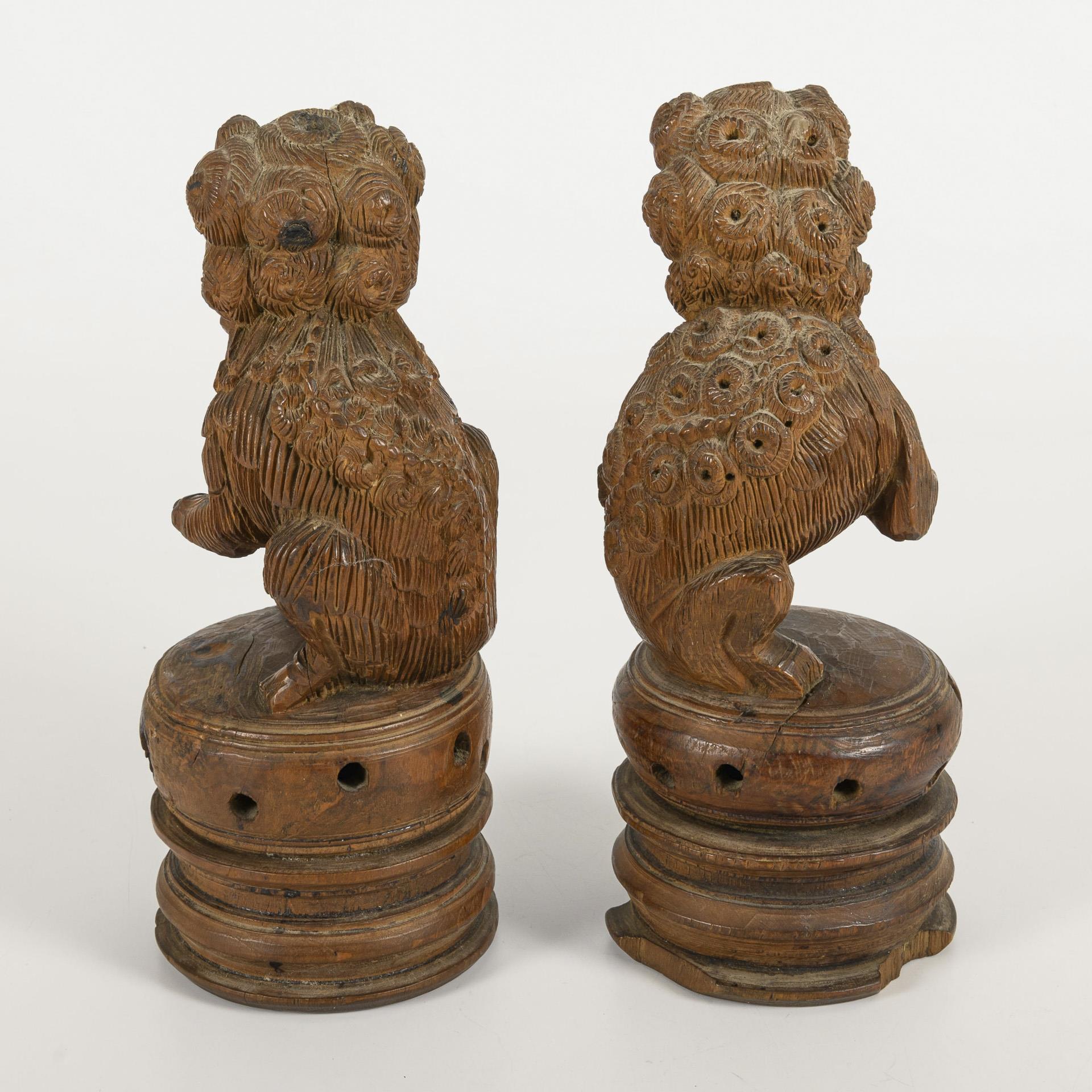 Turned base and elaborately carved palace lions from a single piece of wood. Both with movable wooden bead in the mouth and raised paw. Without ball and cub. Irregular perforations in the base. Base with minor dry cracks and losses to the lower edge.