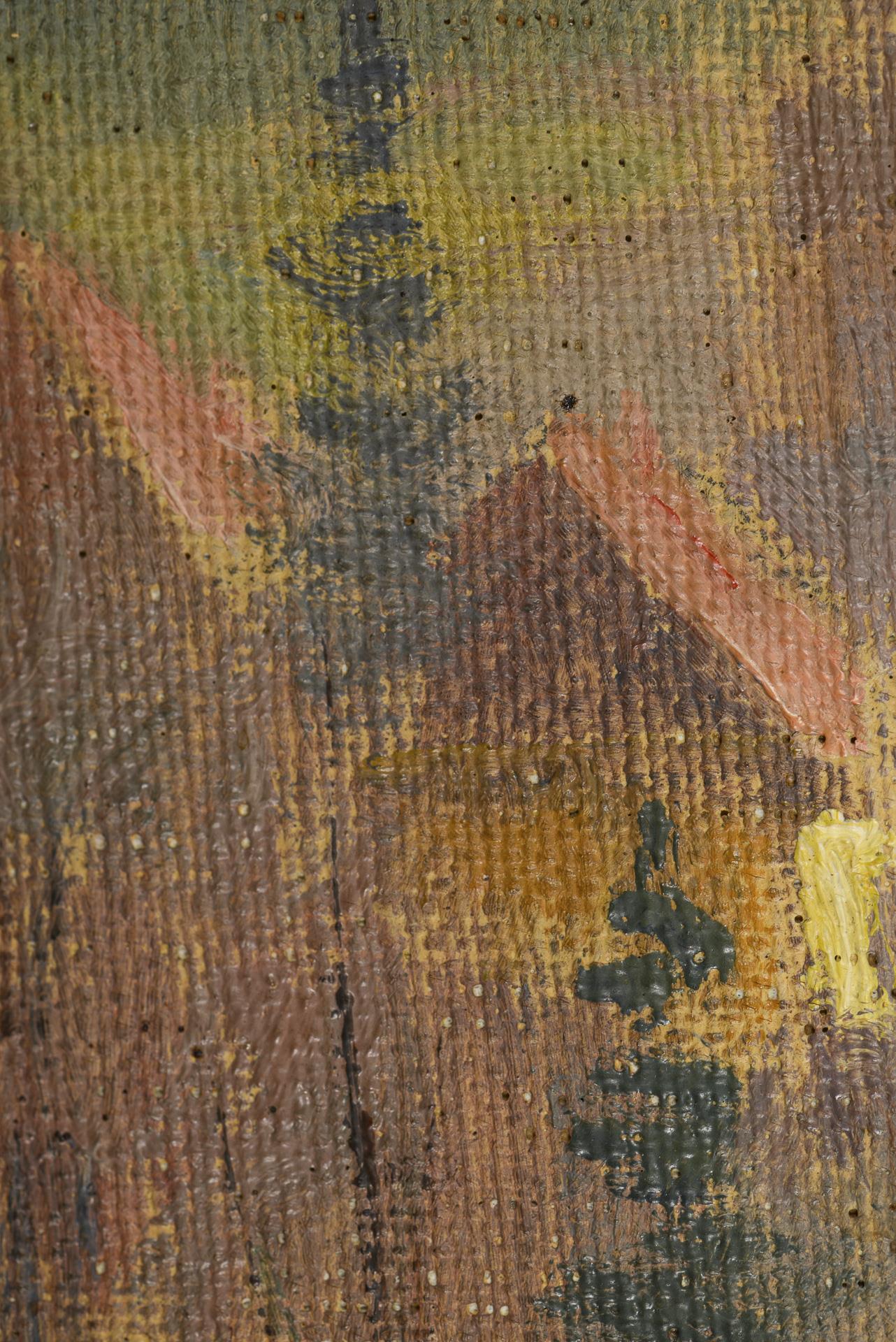 Forest slope with discolored treetops and a house in the sunshine. Minimal traces of age.