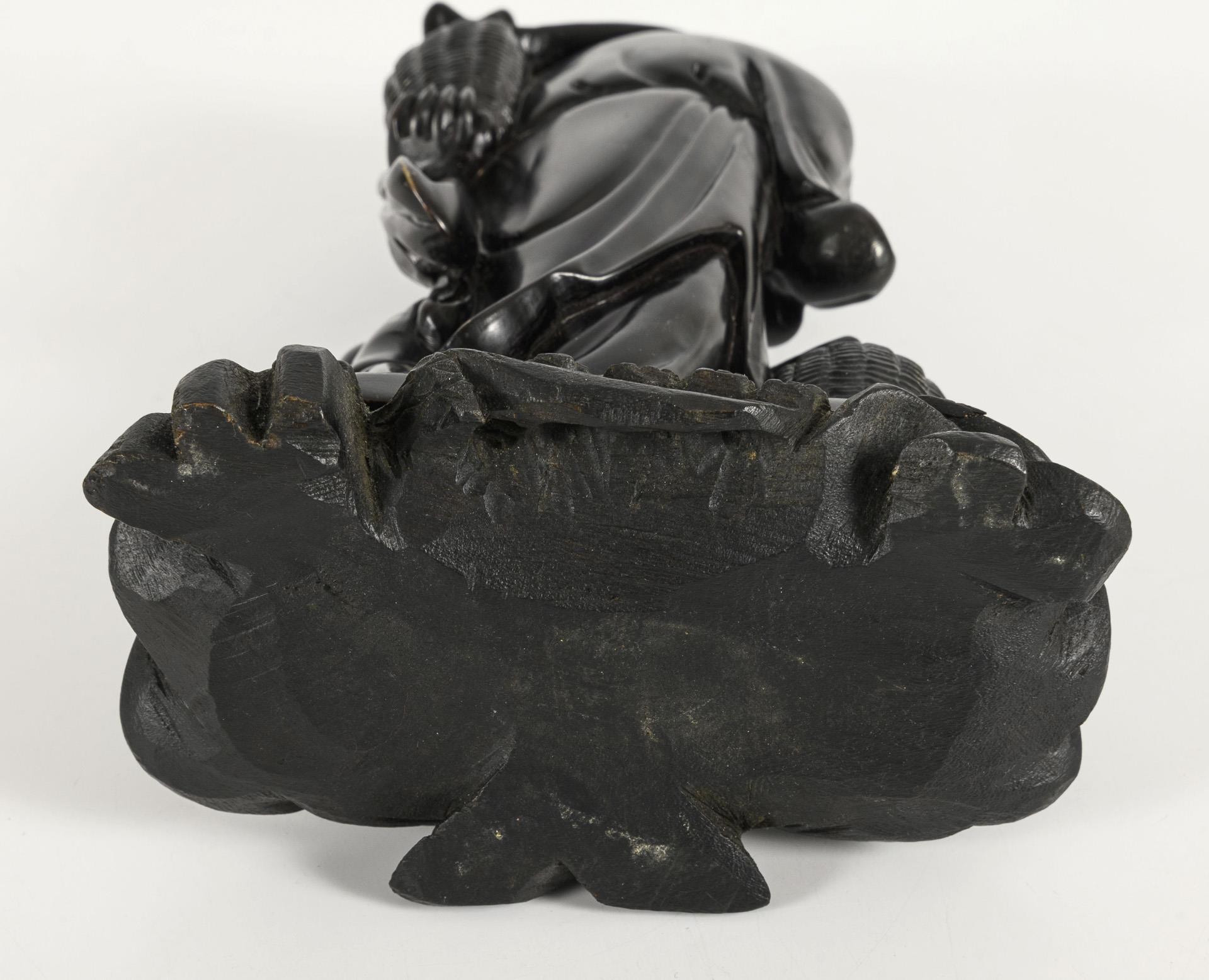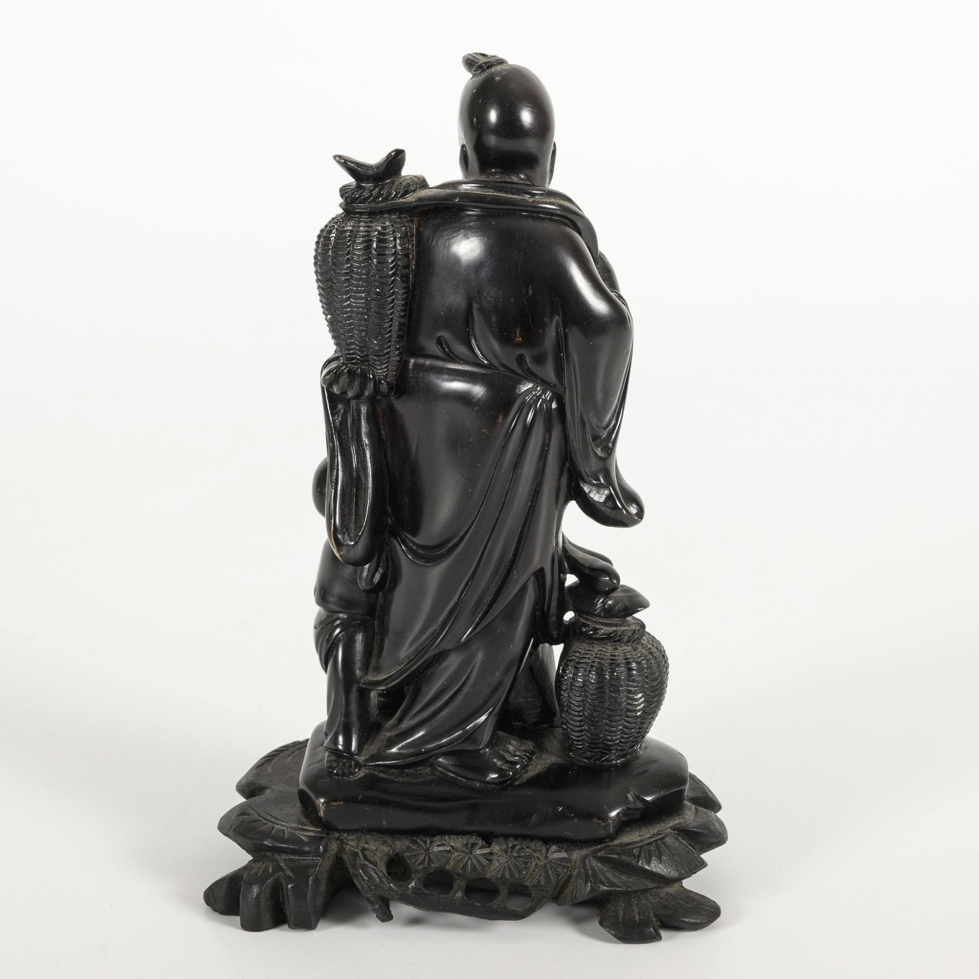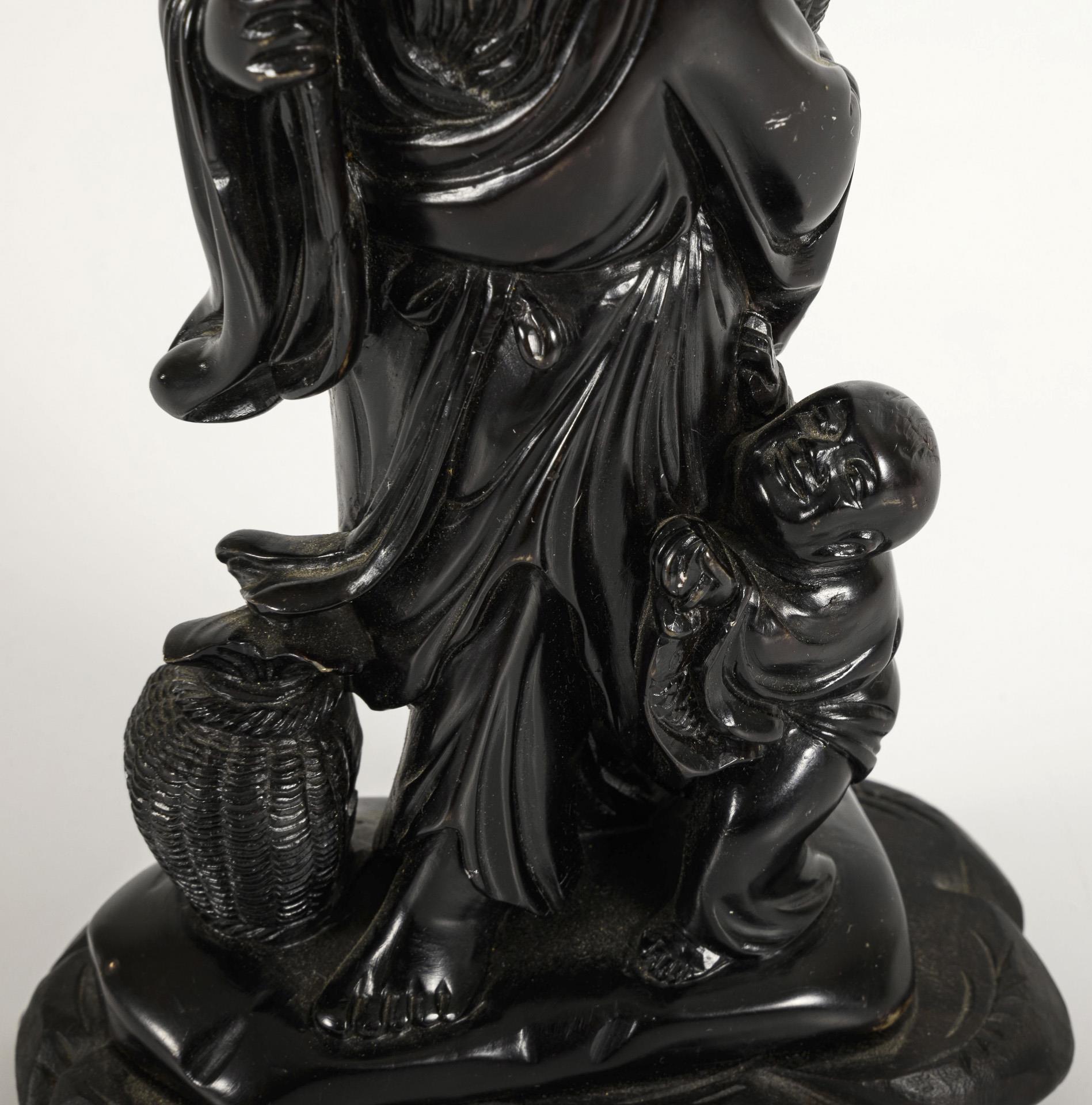 Dark-colored soapstone figure on a wooden base. Both figures with fish or fish baskets. An old chip on the rear base.