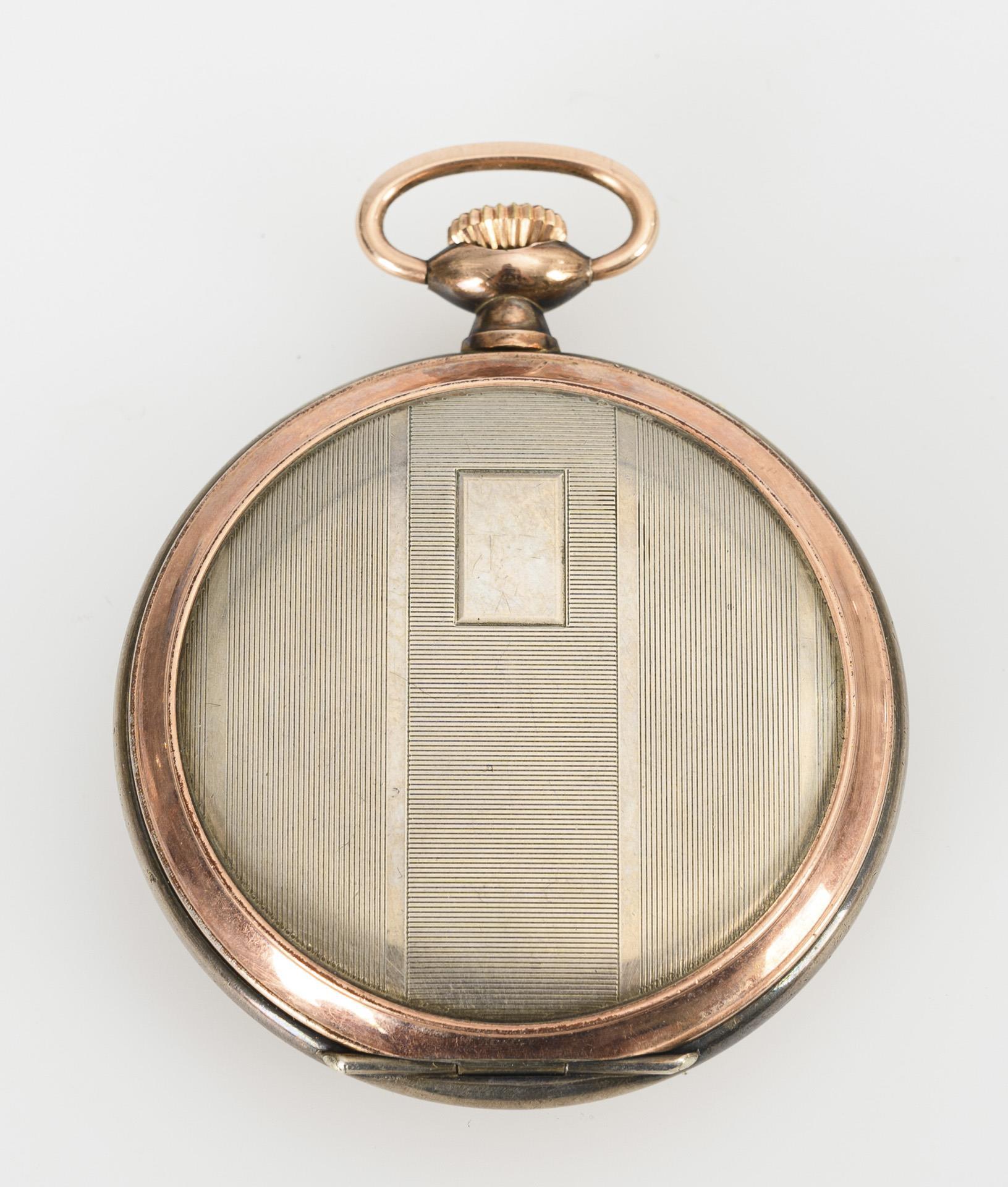Stripe-engraved galonné case with empty rectangular reserve, silver dust cover. Minimal signs of age and wear.