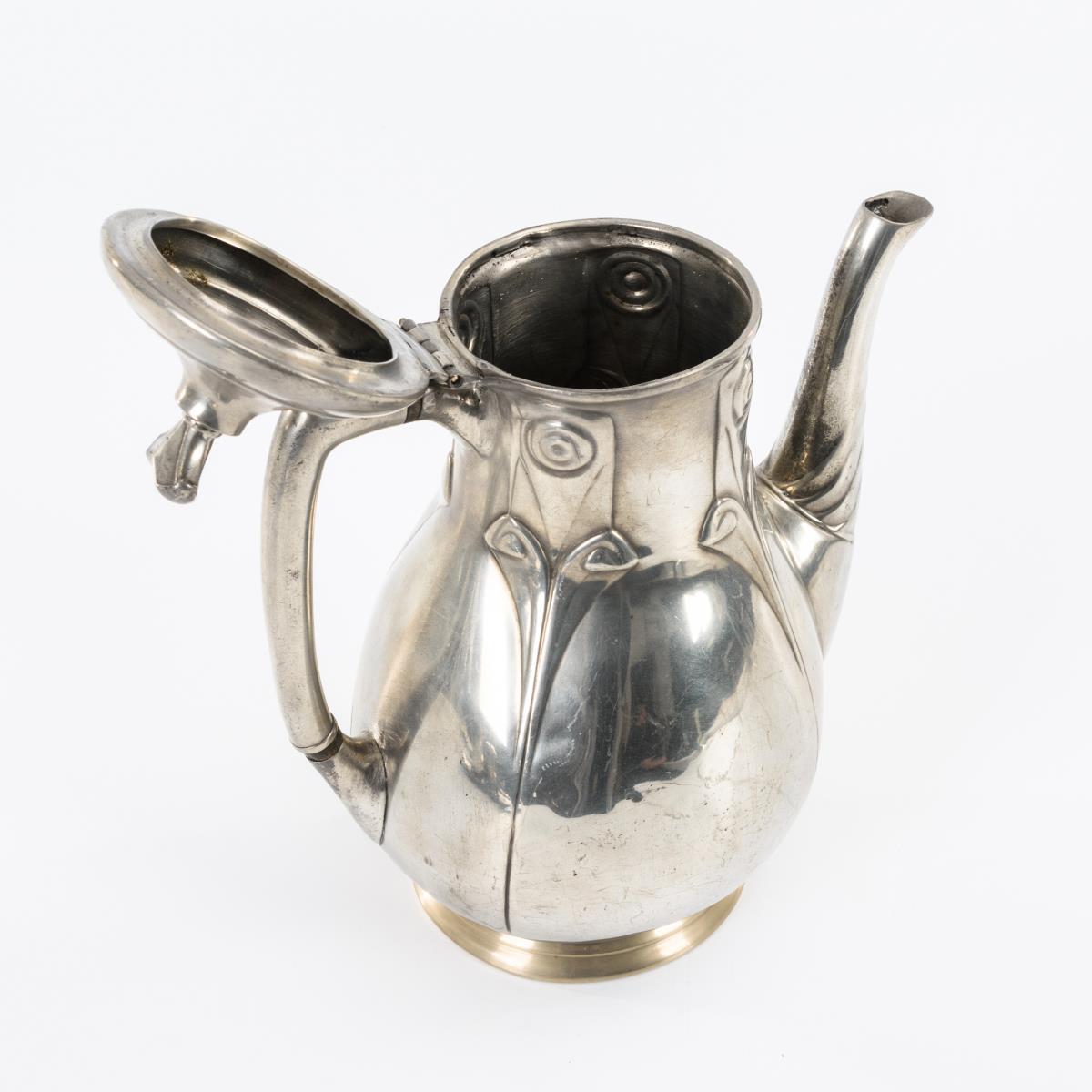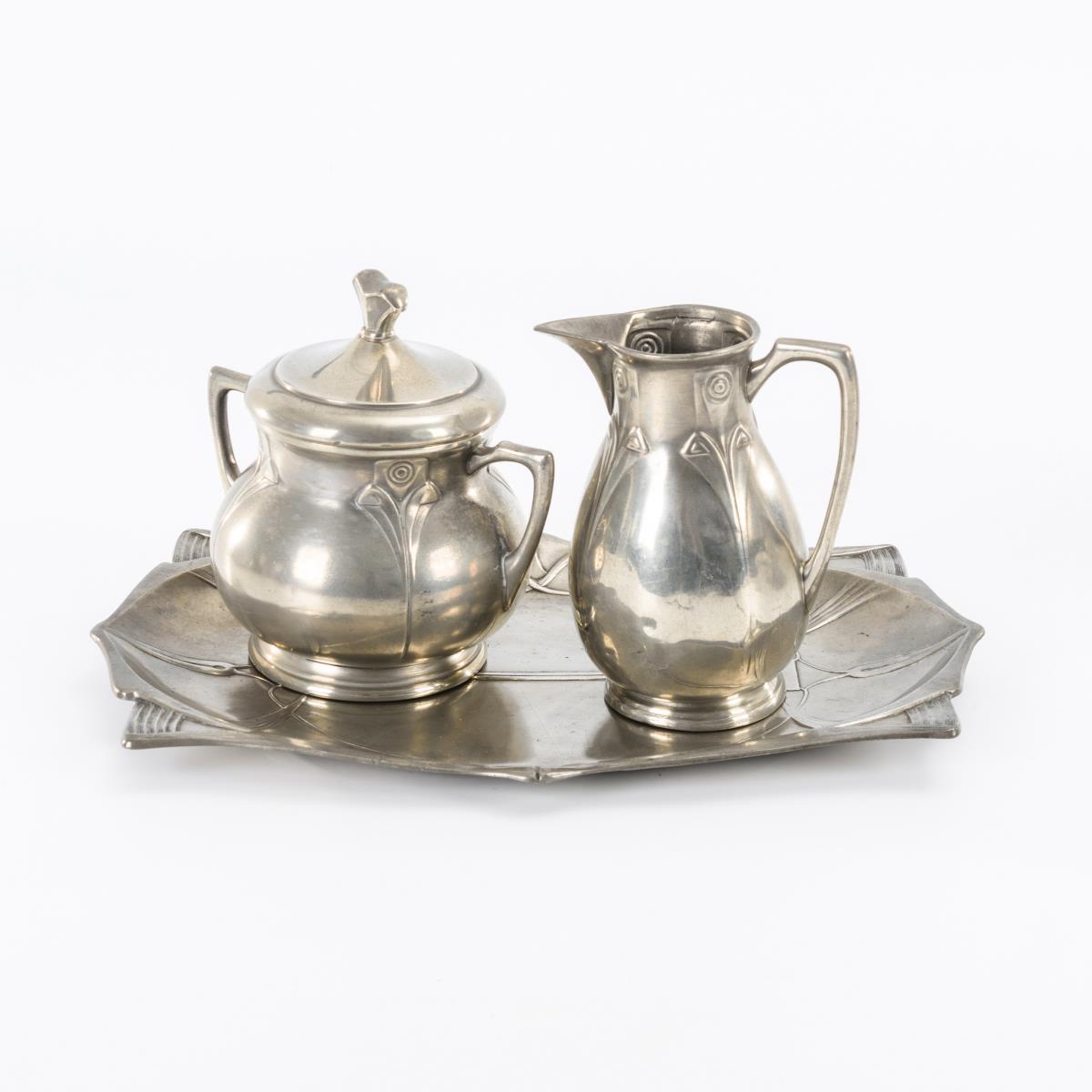 Gleich reliefiertes Kernstück sowie ähnliches Tablett. Lötreparatur am Kannenscharnier, sonst wenige Alters-/Gebrauchsspuren.