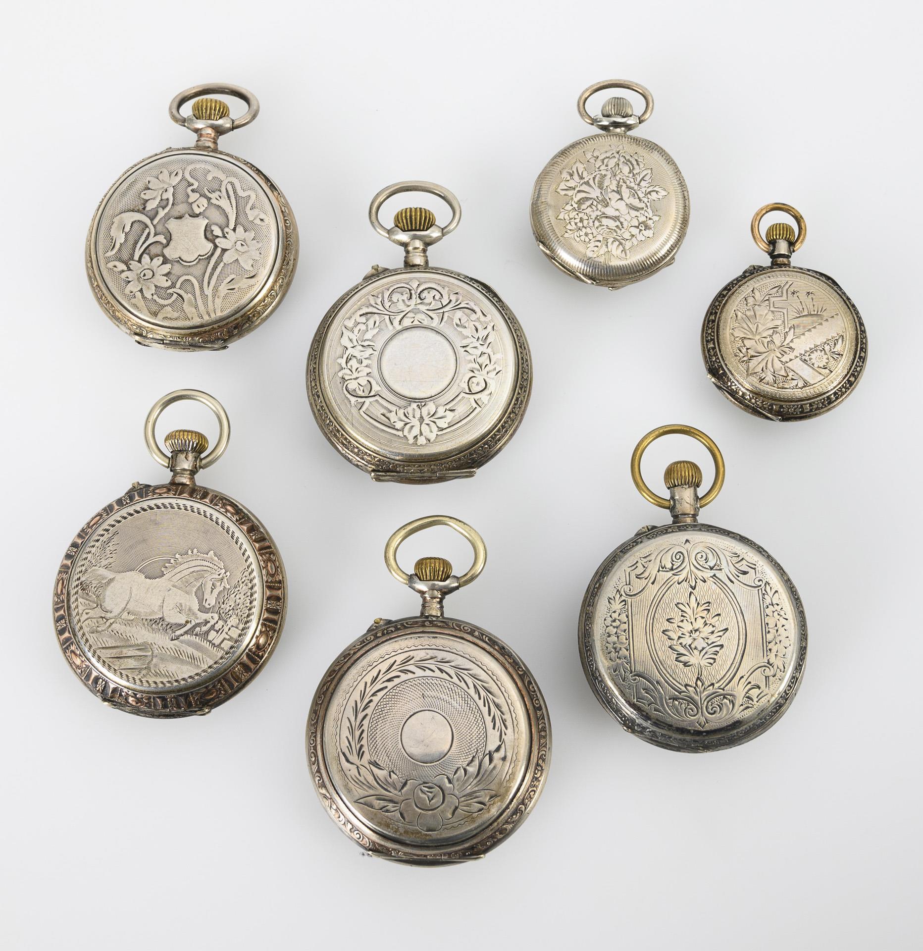 All movements with cylinder escapement and crown winding. Functional in short time test. White enamel dials with colorful floral decoration, Roman and partly Arabic numerals, and mostly small seconds.
