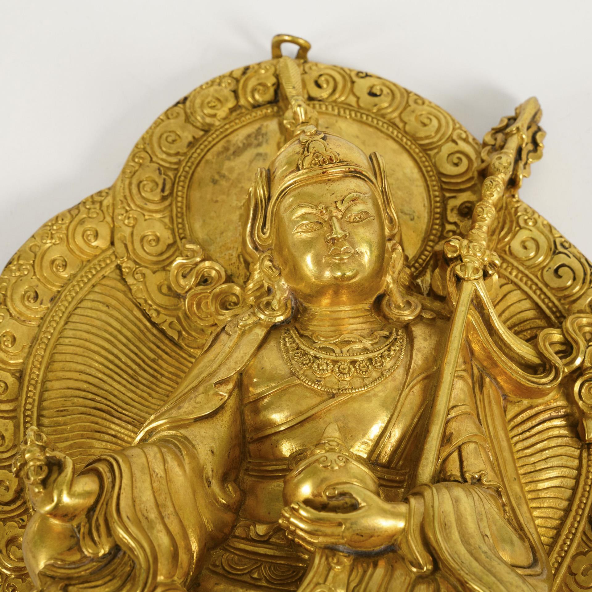 Figure resting in a loose seat, on a double lotus base. In the hands sceptre, box and vajra. Double nimbus and crest. The back and underside closed. Careful workmanship with rich ornamentation. Eyelet somewhat bent.