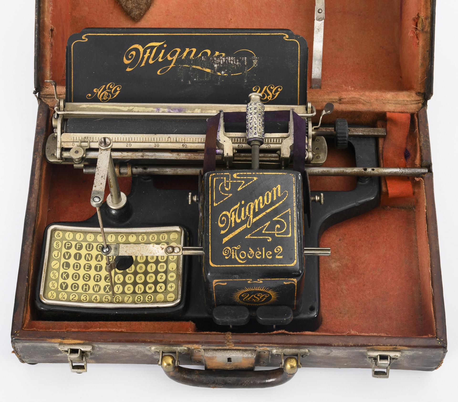 Machine "Mignon AEG USG" "Modèle 2" "Breveté S,G.D.G" marked, case unmarked. 1905-1913.