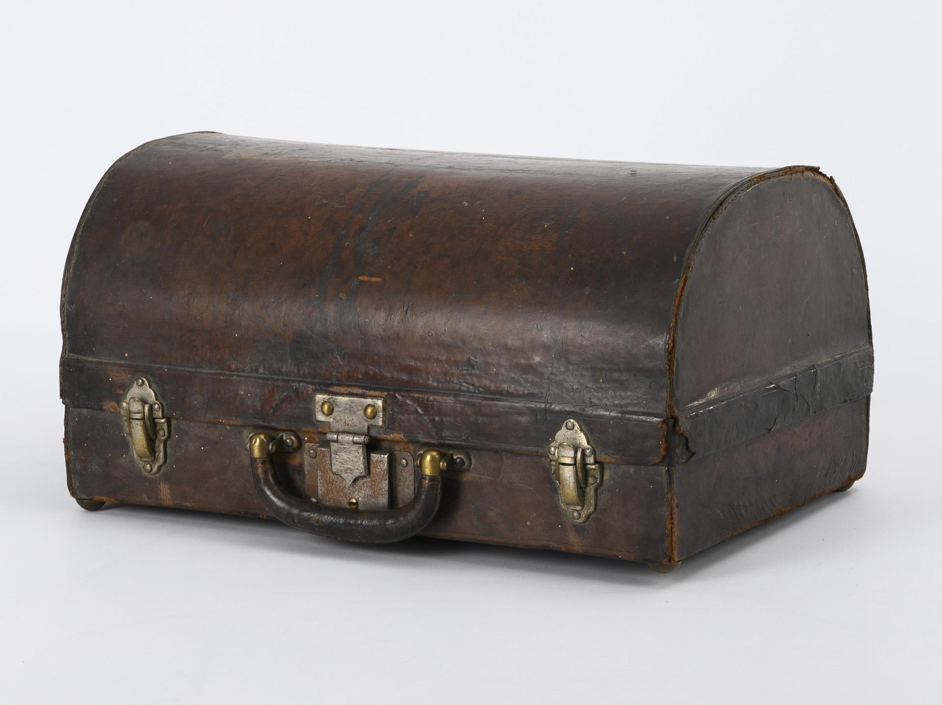 Wooden case with leather cover and nickel-plated fittings; inside lined with red velvet. Removable typewriter with the one-pointer above the German letter tableau and upper cover with replaceable type cylinder. Signs of age/use on the case. Typewriter complete, fully functional, minor signs of age/use.