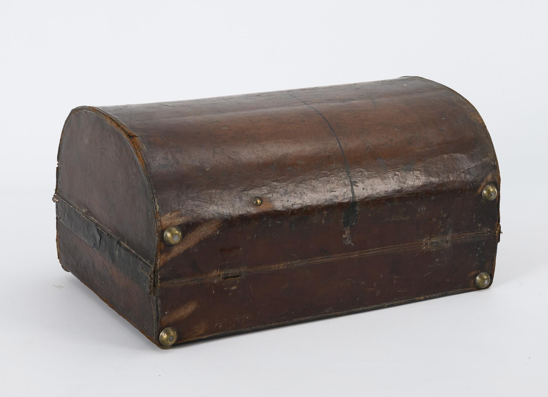 Cast iron, sheet iron and papier-mâché painted black or nickel-plated, gold lettering. Case 20 x 40 x 28 cm. L writing roller 23 cm.