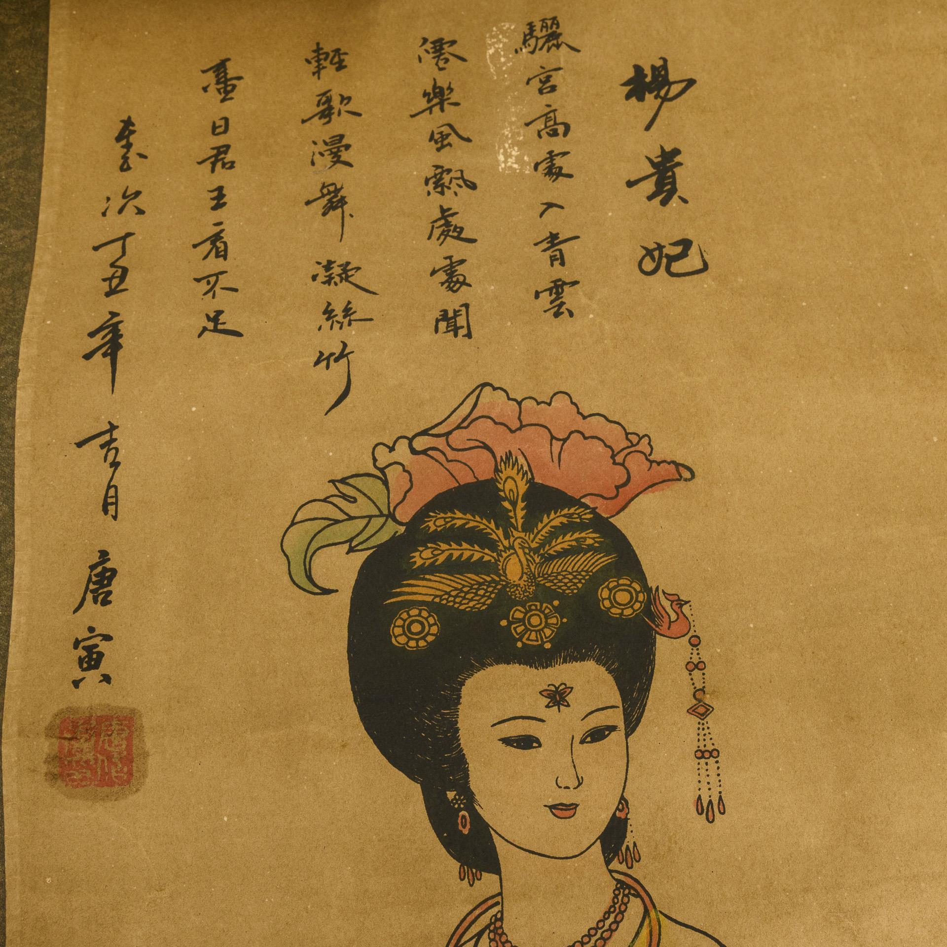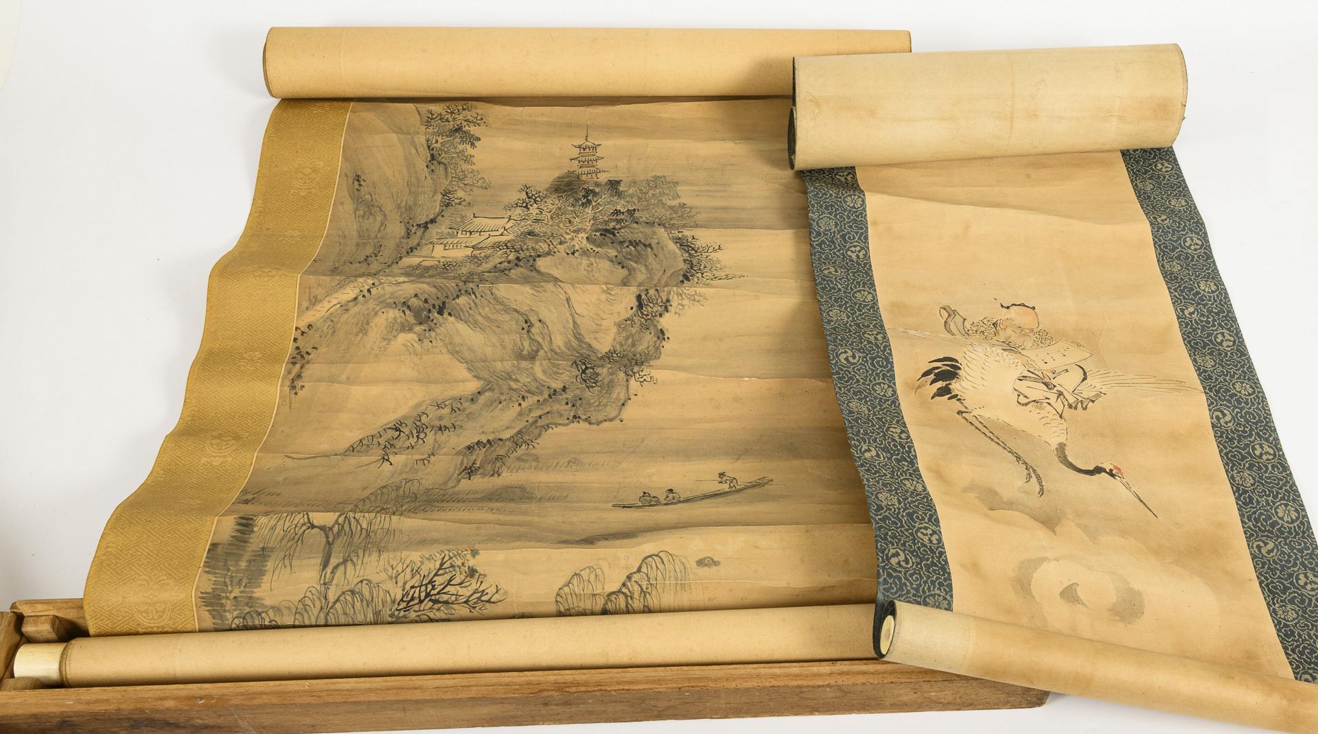 Plant still life, ink drawing on silk, (165 x 54 cm). / Young adorned woman between flowers. Color woodcut on paper. (136 x 37 cm). / Scholar on a crane. Probably painting on paper. (155 x 38 cm). / Scholar, probably ink on silk. (114 x 54 cm). / Landscape with lake and mountains, probably ink drawing on paper. In an inscribed wooden box. (206 x 25 cm). All with varying traces of age and use.
