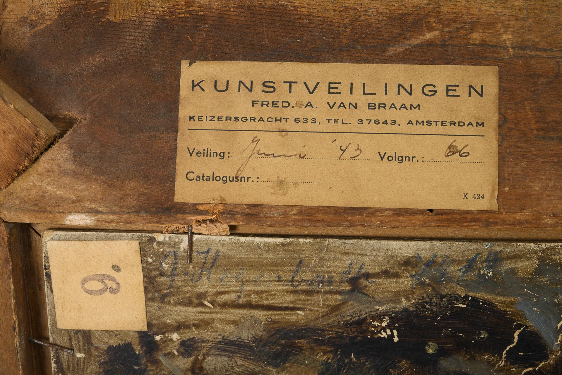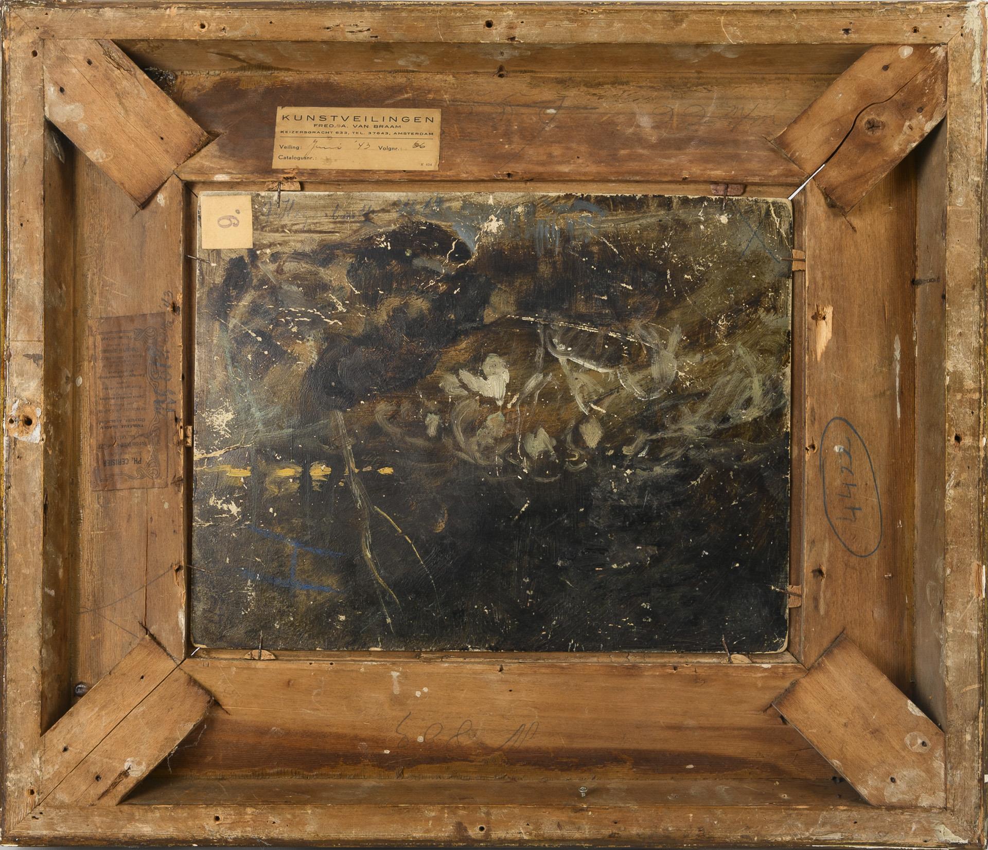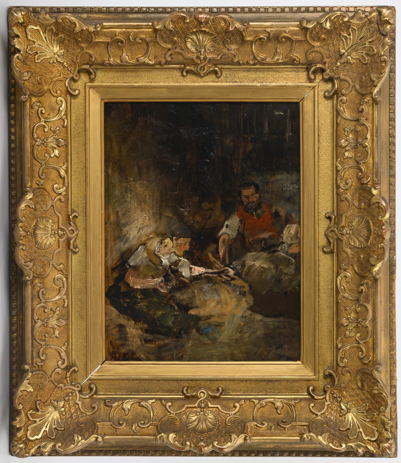 Expressively painted study with the peasant couple and the vaguely recognizable animals in front of the wall of the stable. Minimal traces of age.