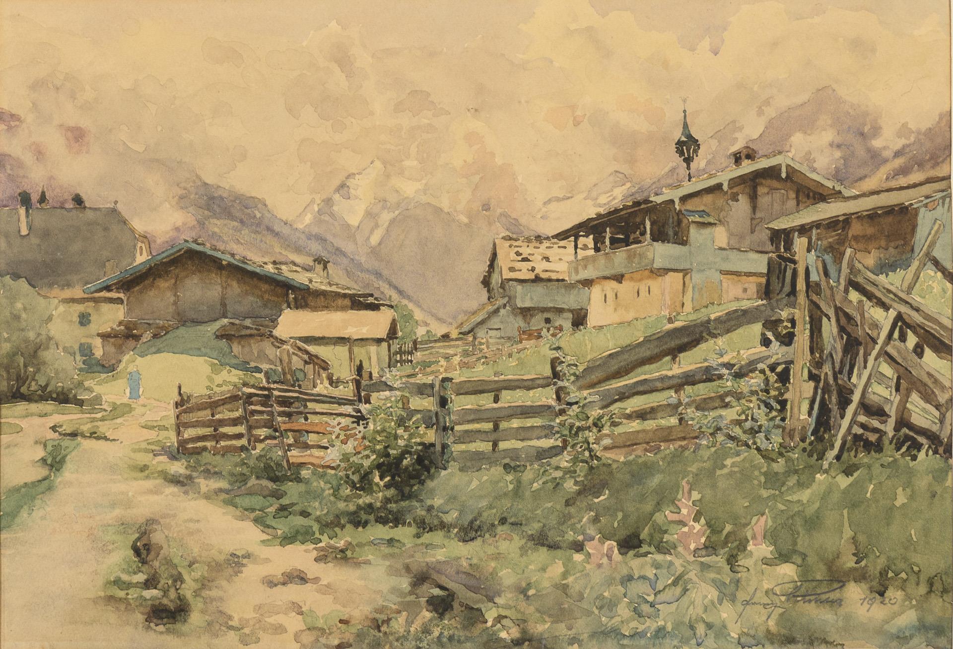 High-quality watercolor with the Alpine houses on the green hills in front of the peaks in the clouds.