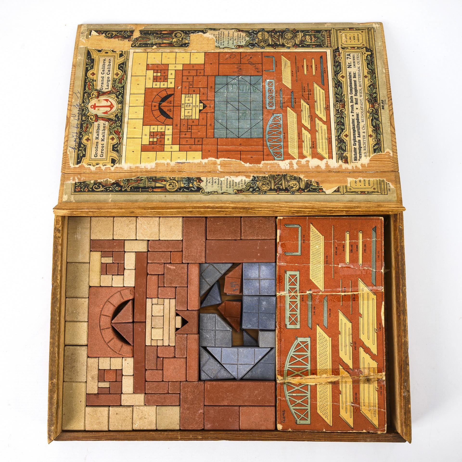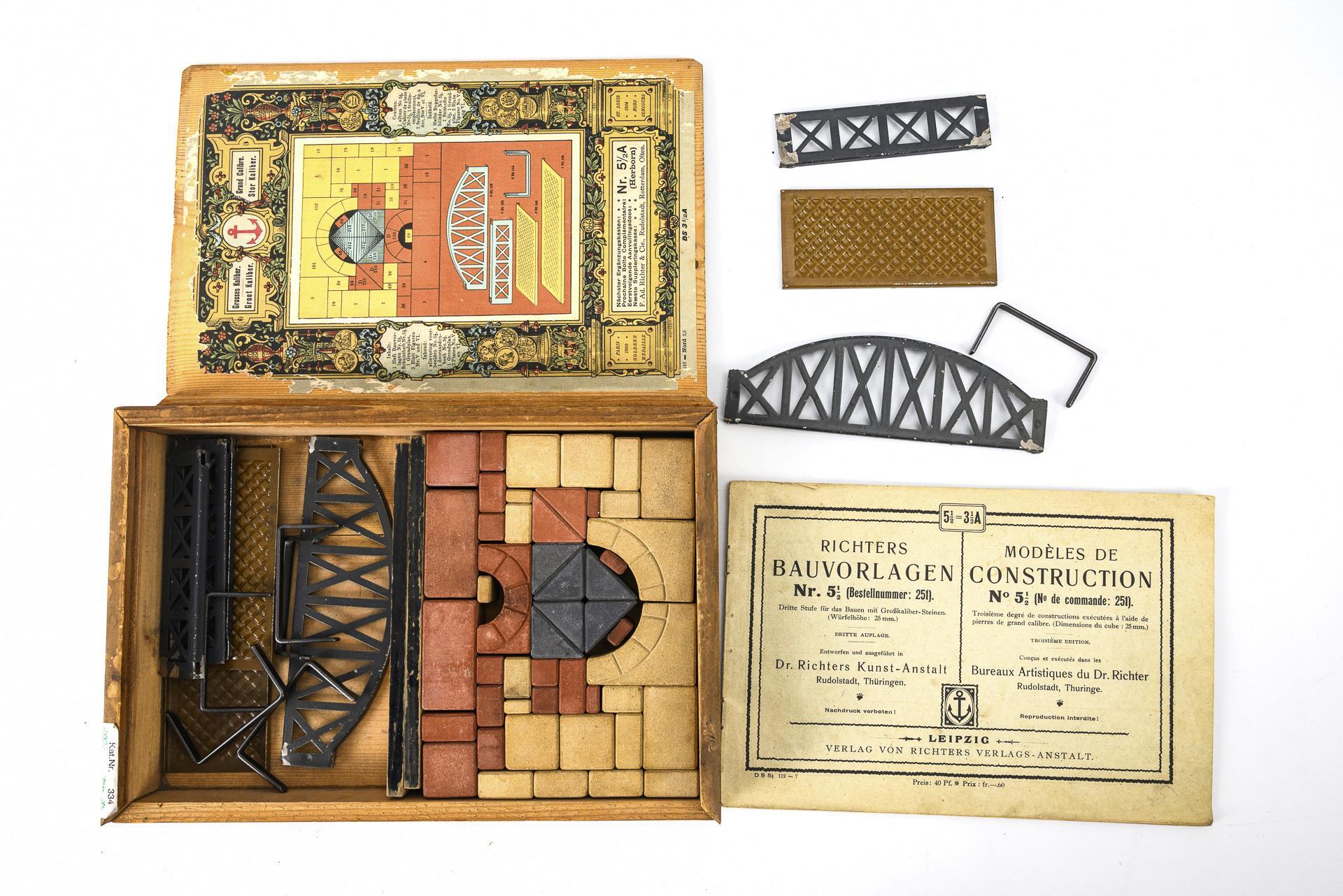 Supplementary box no. 6 A, with a copy of the building plan. 5 x 37 x 24.5 cm. / Stone building set no. 5 1/2, password Erkner. 6 x 37.5 x 28 cm. / Large caliber kit no. 3 1/2 A, password Hanau. 4 x 27.5 x 19 cm. / Large caliber box no. 4 U, password Babel. All sets with building plans, completeness not checked. Worn, with signs of age. Boxes with defects.