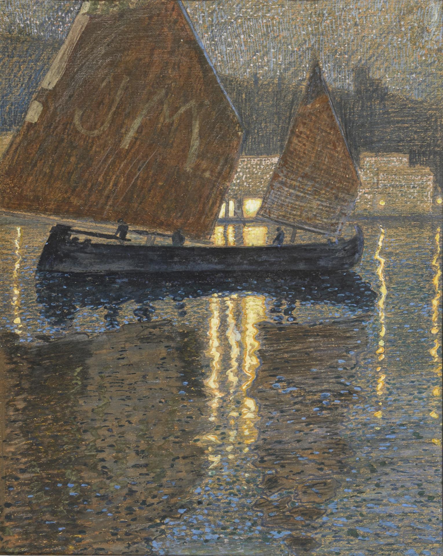Mixed media. Probably monogrammed "J.M." in the sail. Circa 1910.