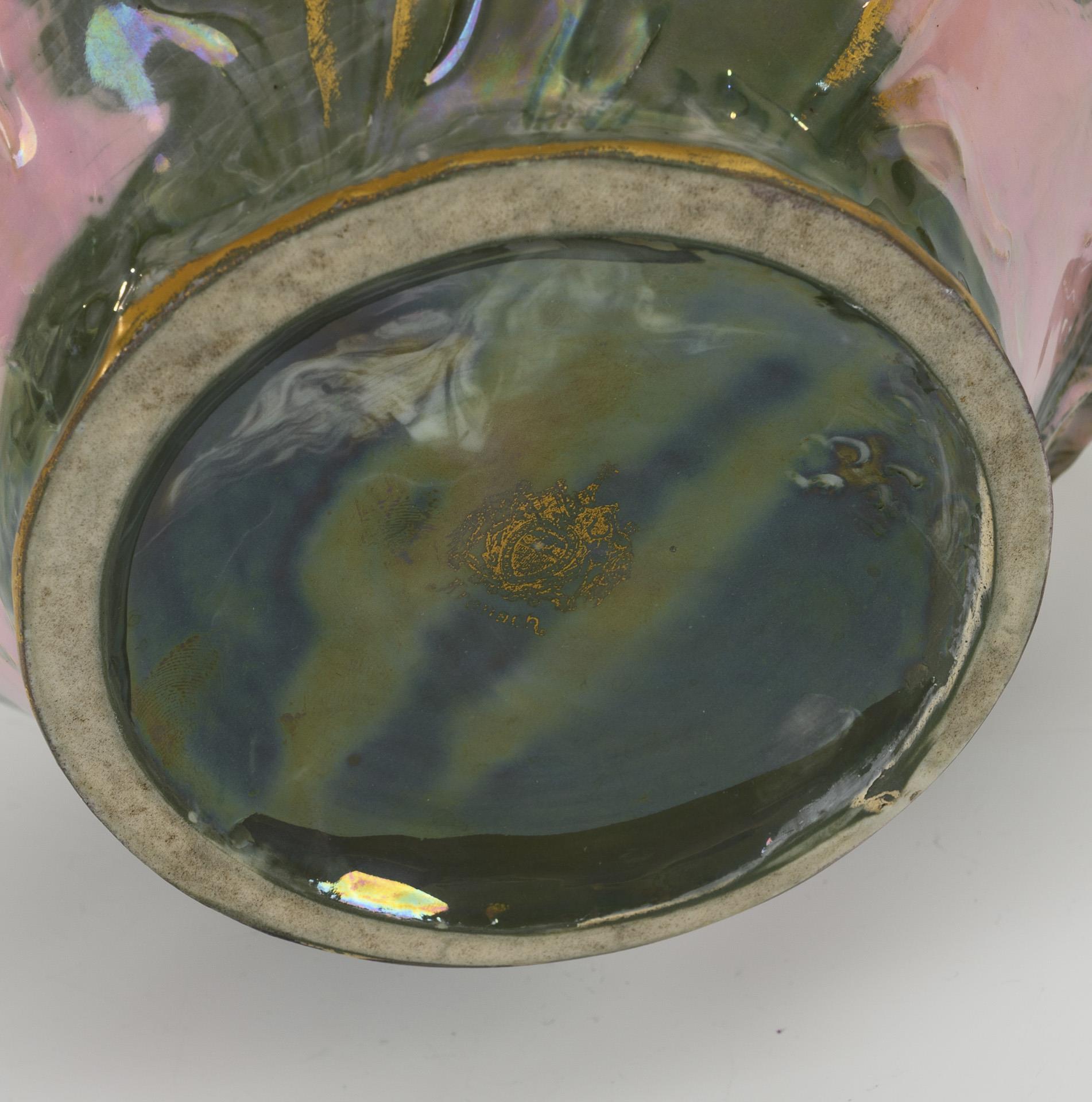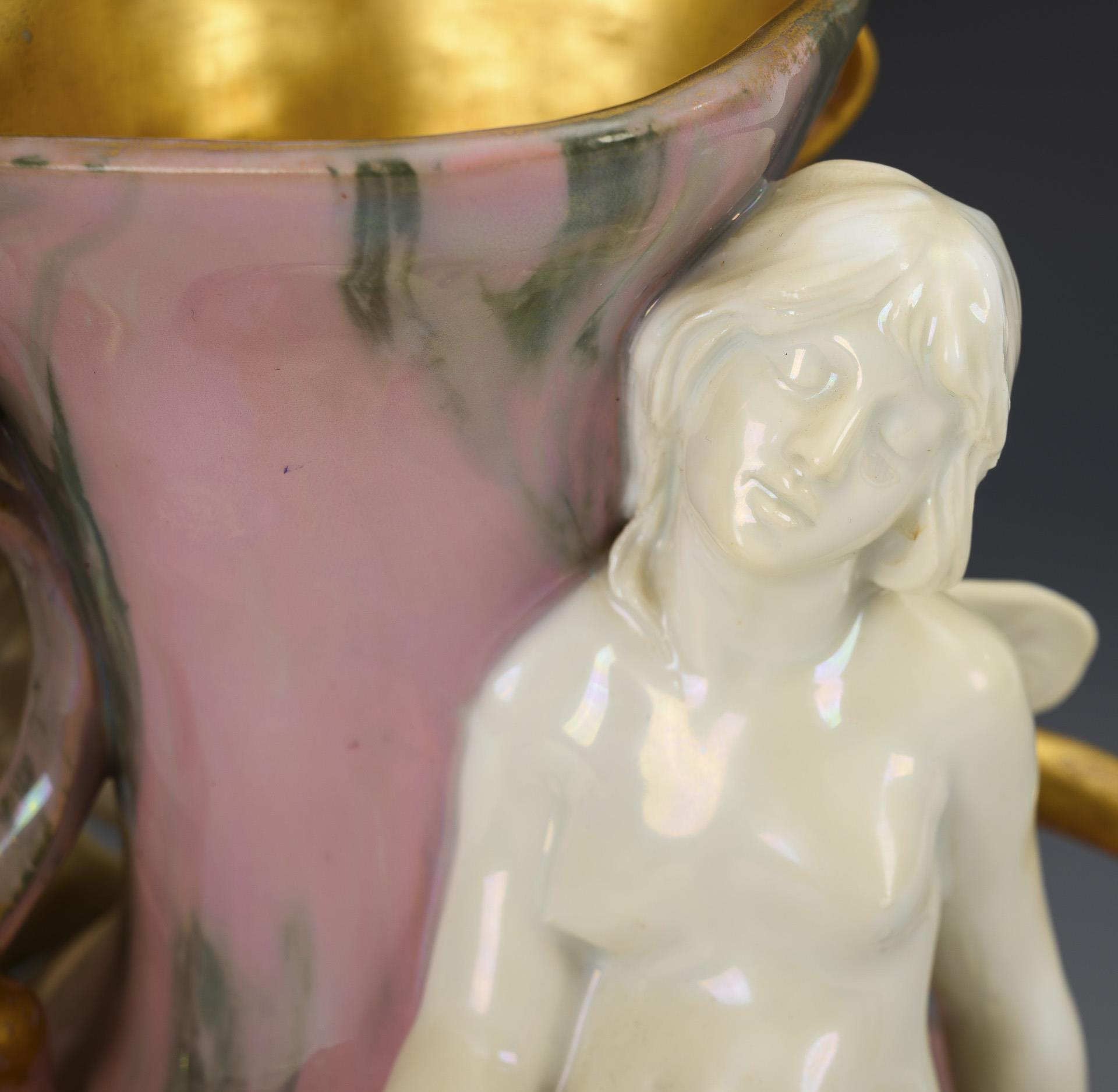 Green-pink marbled glaze, ivory figures, lustre, gold decoration. H 23.5 cm.