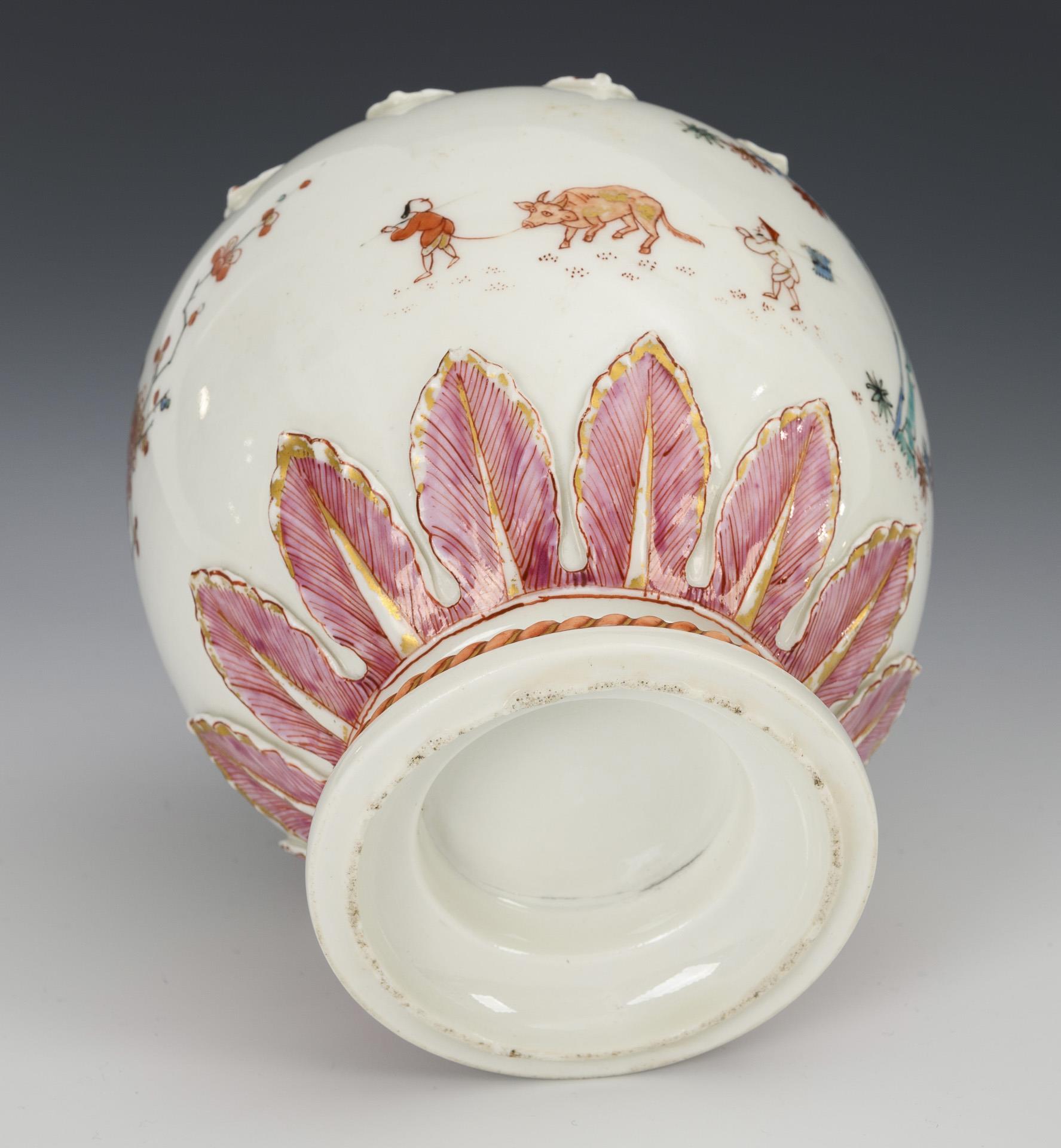 Baluster jar with a leaf relief wreath on the stand and on the shoulder. The wall depicts a phönix at a rice straw hedge and two farmers with an ox. Without lid, leaf tips minimally bumped in places, gold somewhat rubbed, small chip to the rim.