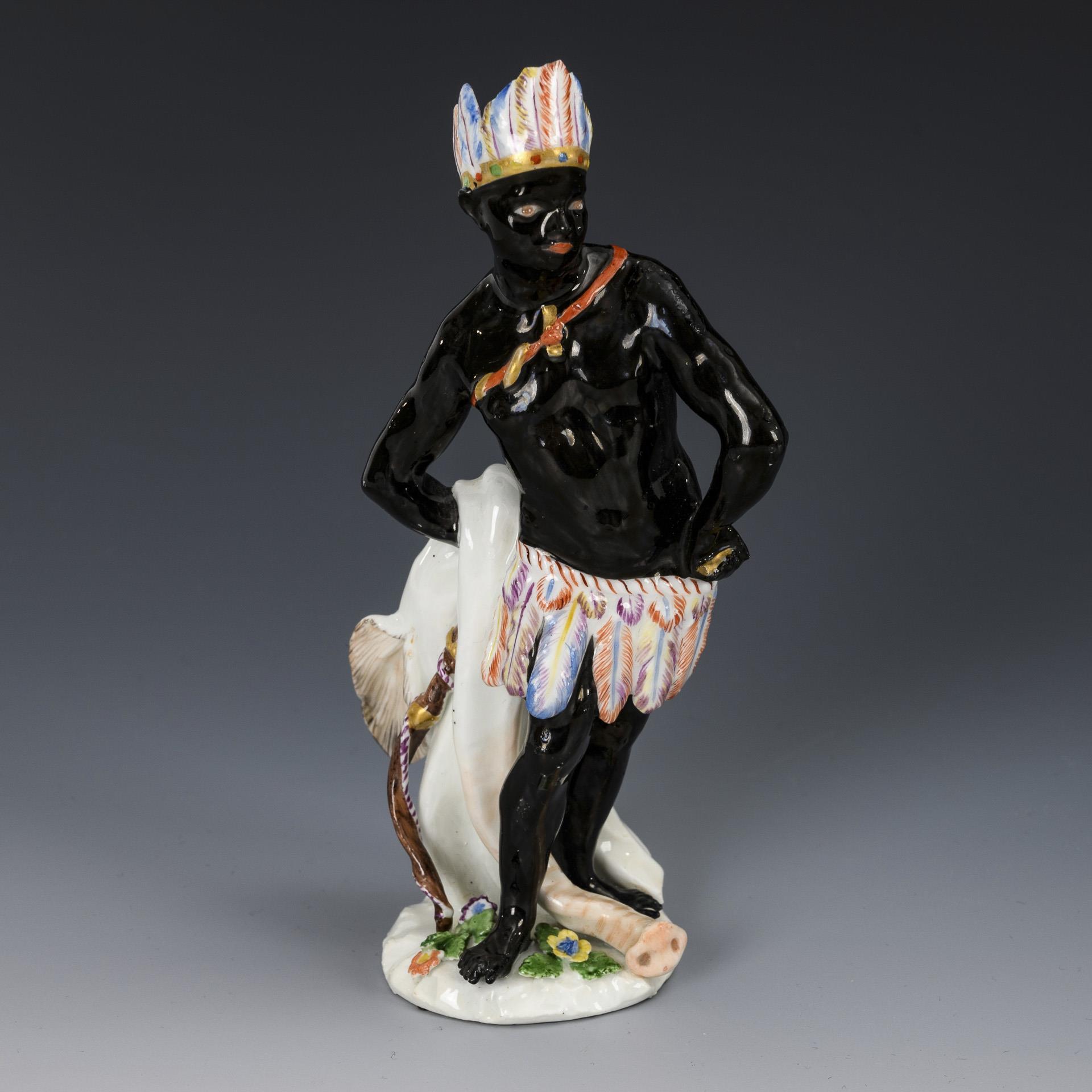 Standing African with feather ornament and bow, carrying an elephant skin. Large toe of the right foot restored, feather ornament on the head chipped, arrow (?) in the left hand chipped.