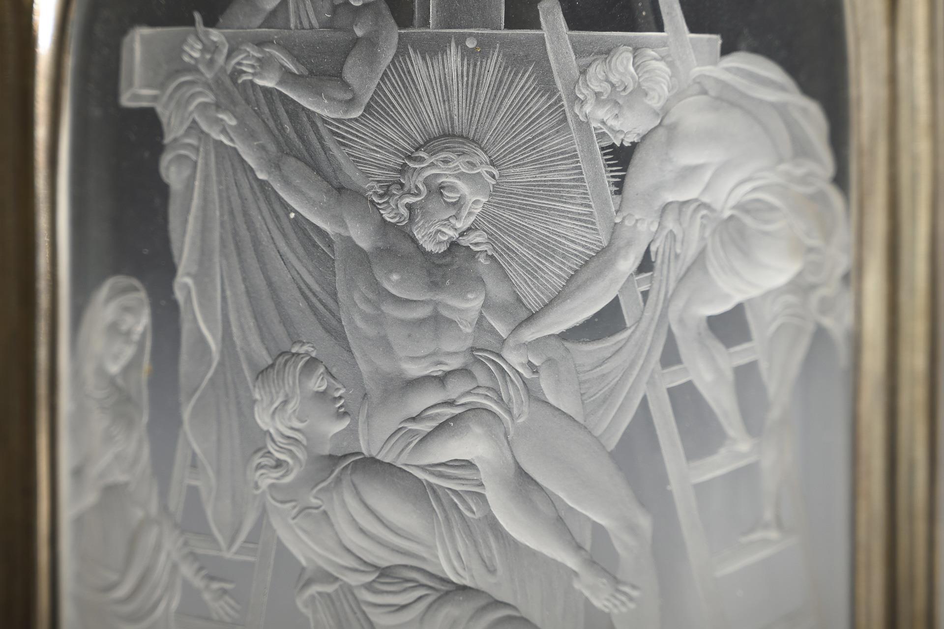 Gothic-style silver display frame with candle holder on the back. Inlaid clear glass plate with the finely engraved depiction of a Descent from the Cross.