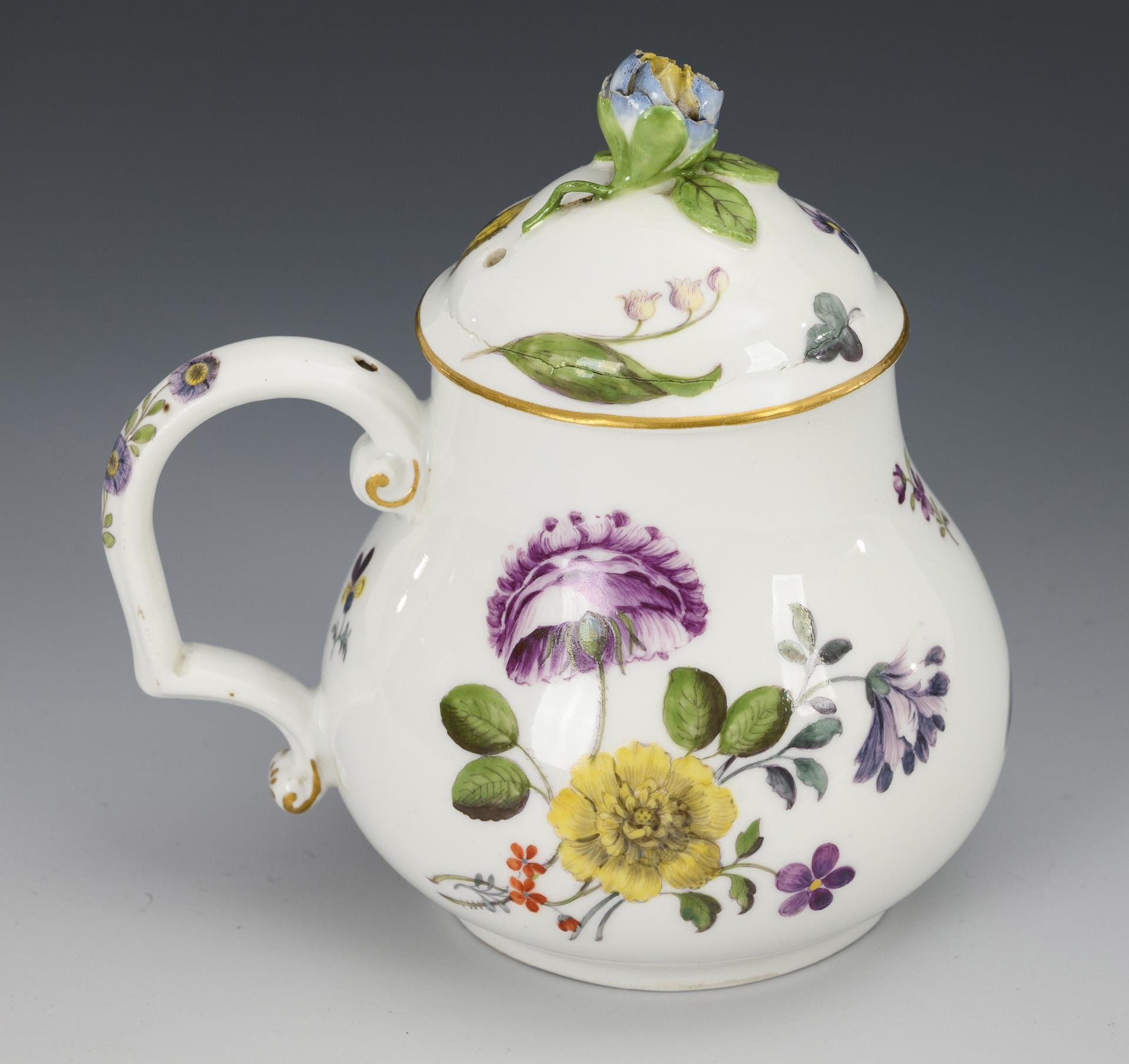 Compacted pear shape with side handle and flower finial. Fine floral painting on all sides. Flower knob bumped, snail tip minimally bumped.