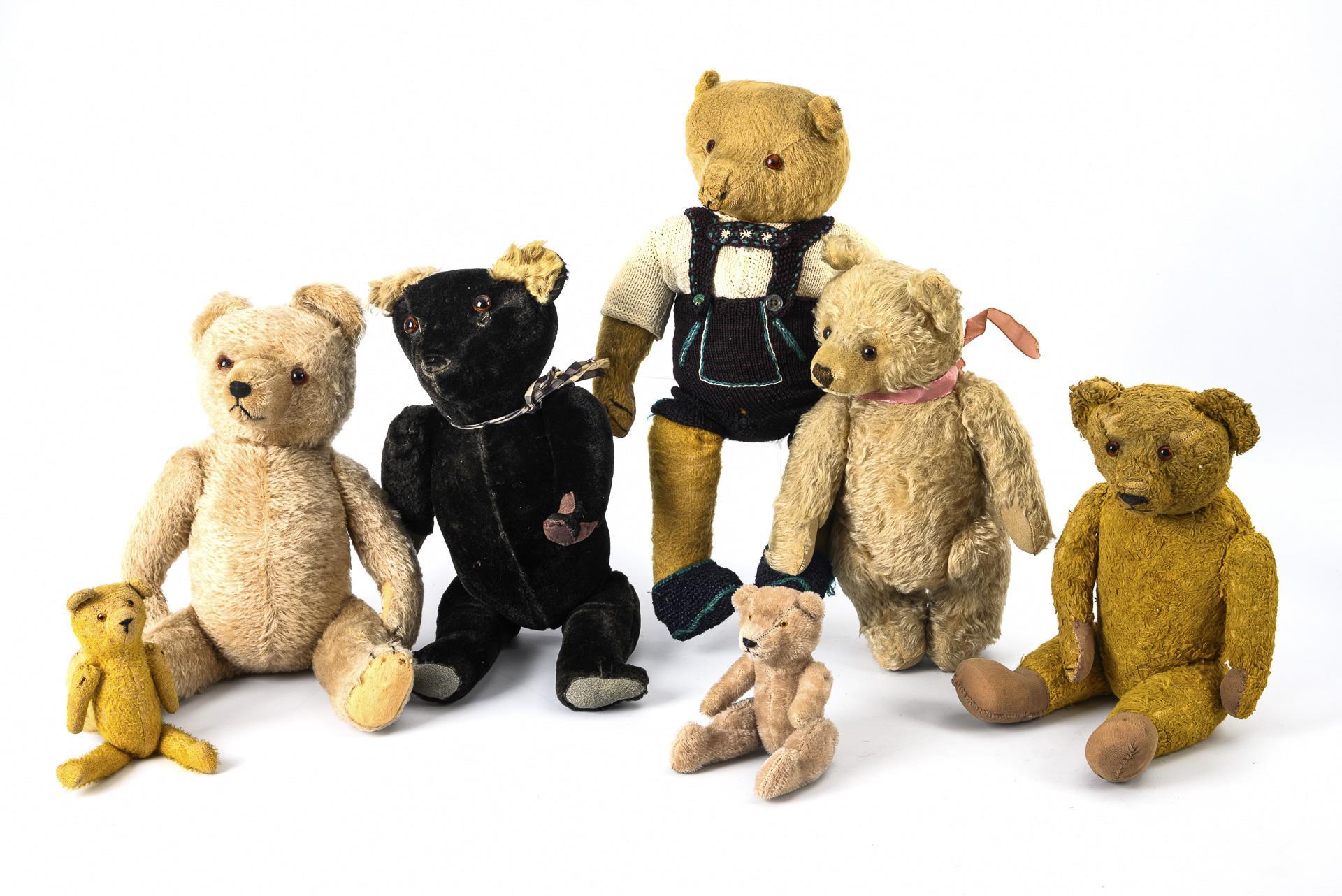 Various teddy bears, including 1 rare black bear with white ears. Condition of preservation varies.