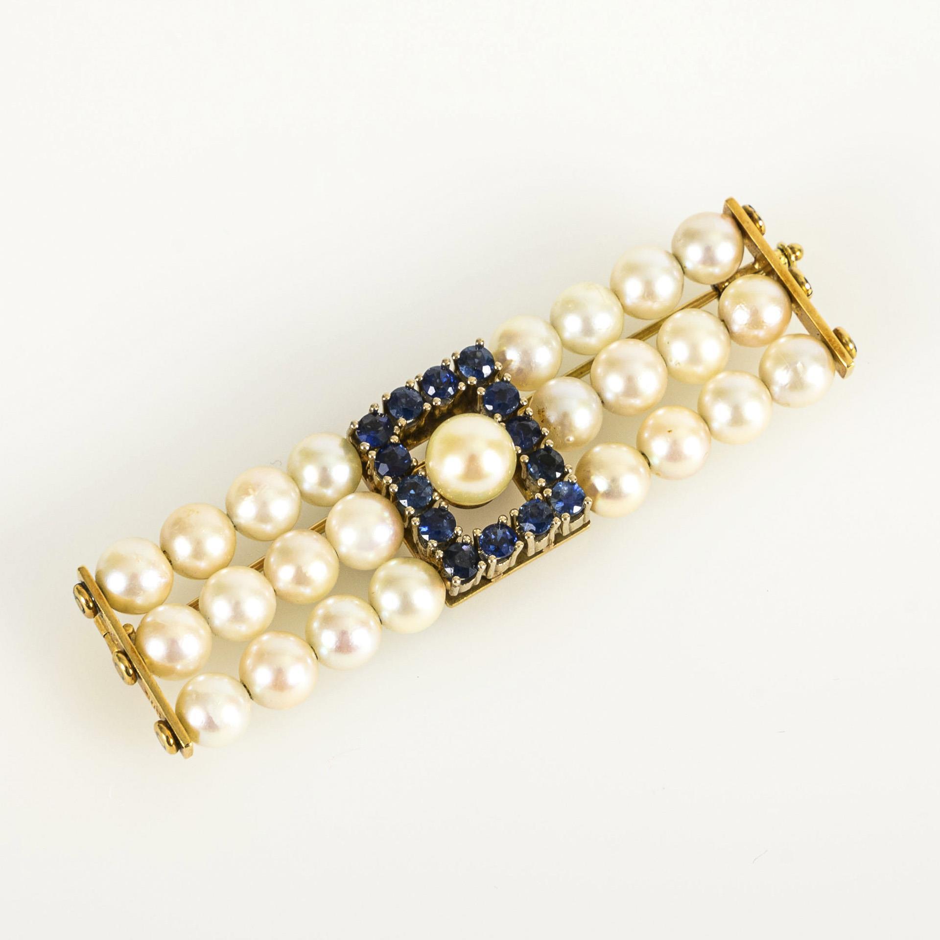 Rectangular brooch with 3 rows of 4 pearls on each side, in between a rectangular element made of chaton-set blue colored stones, probably sapphires, with attached pearl, the pin with sliding lock. Pearls with natural growth marks.