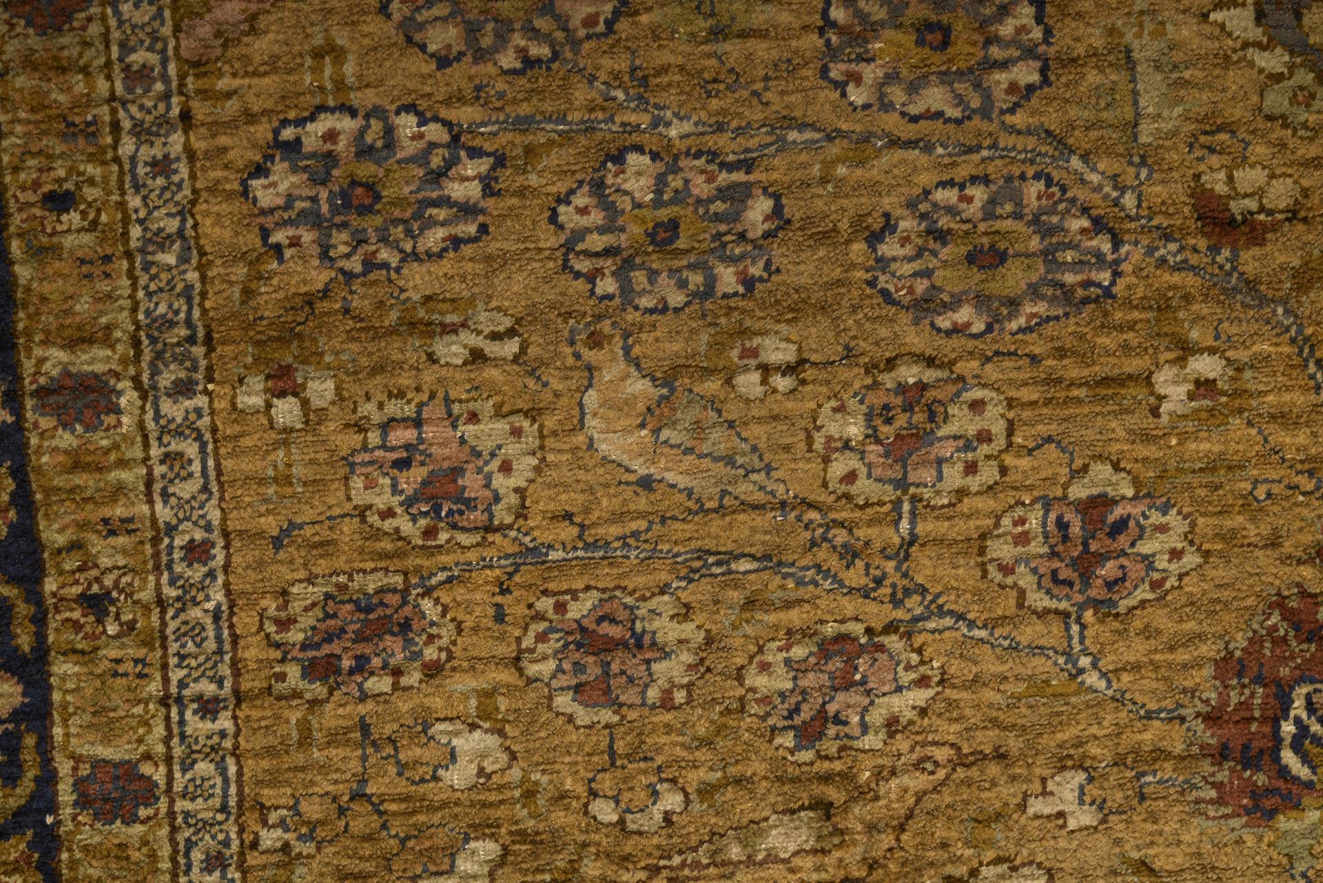 Central vase motif with a multi-tiered tree of life with various flowers and exotic birds. Multi-row border with palmettes and floral tendrils. Short kilim finishes with partly twined fringes. Replaced, partially incomplete suspension loops on the verso. Signs of age and wear, fringed ends repaired.