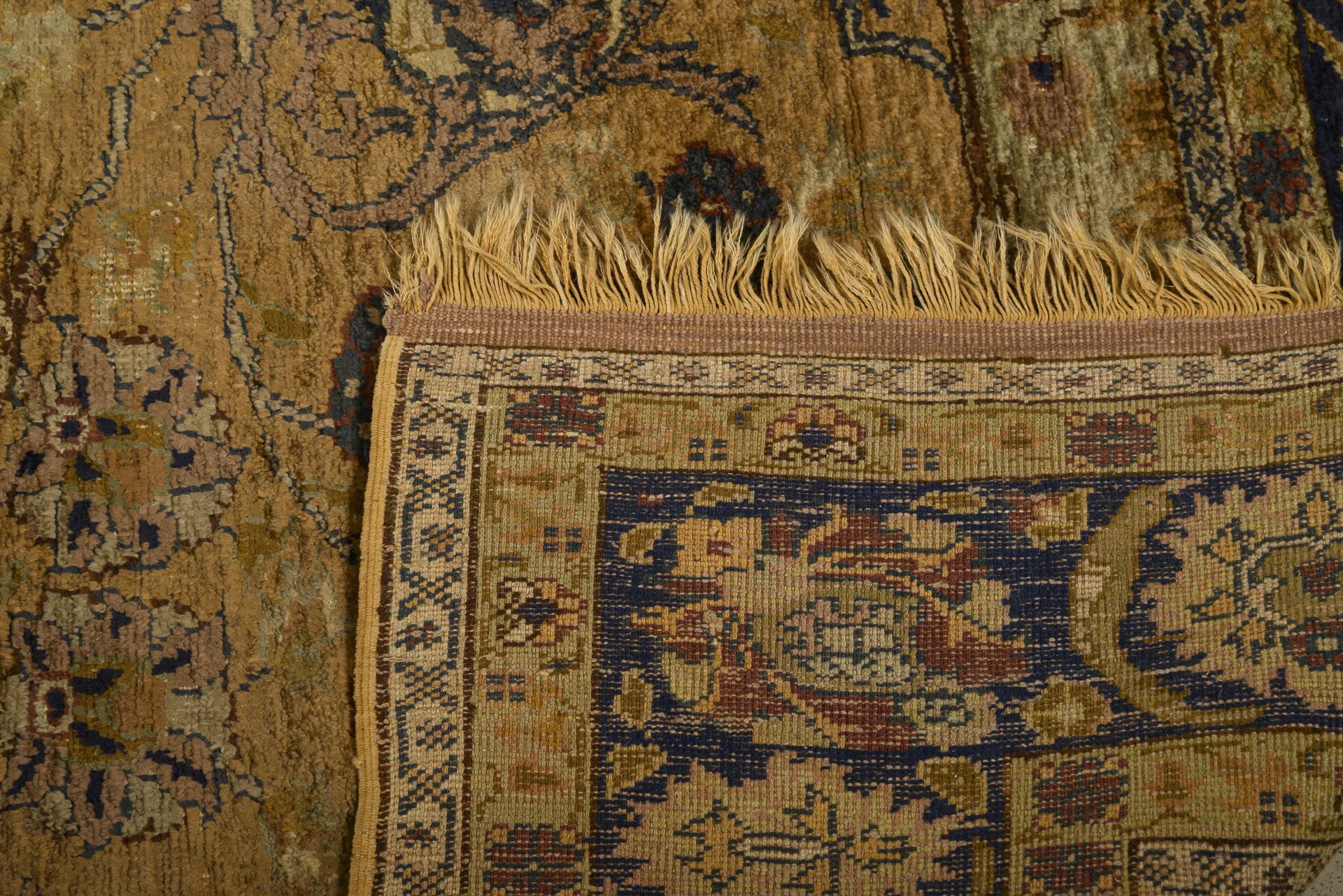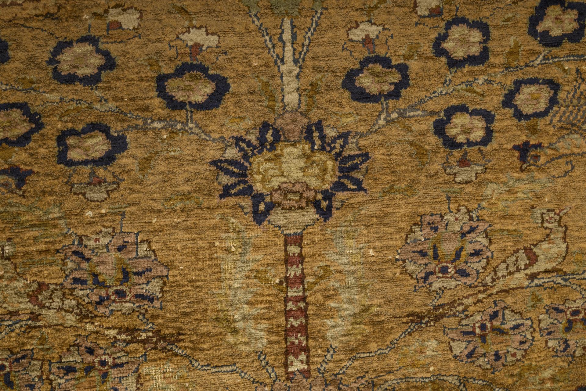 Central vase motif with a multi-tiered tree of life with various flowers and exotic birds. Multi-row border with palmettes and floral tendrils. Short kilim finishes with partly twined fringes. Replaced, partially incomplete suspension loops on the verso. Signs of age and wear, fringed ends repaired.