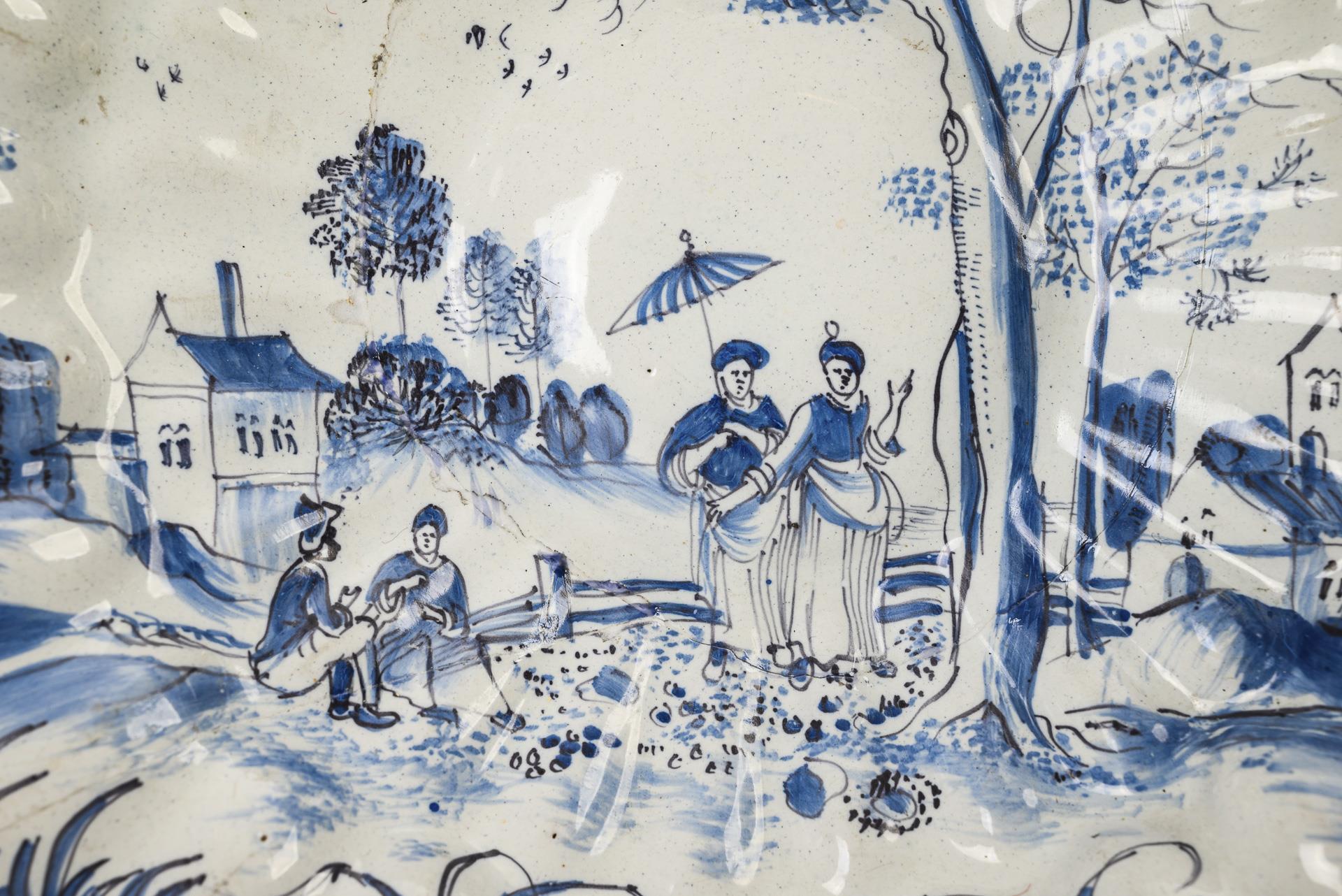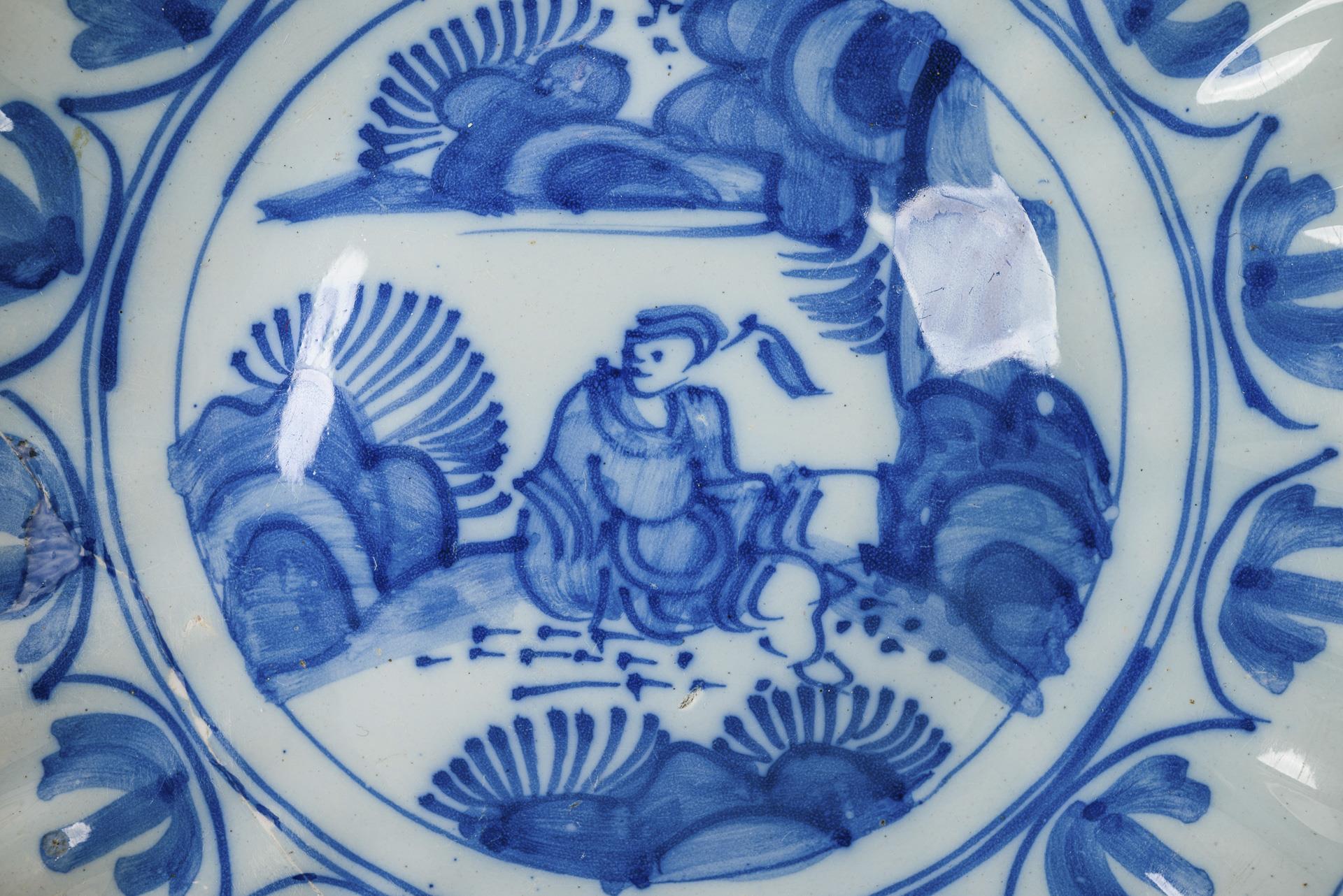 Glazed white and paste blue, painted in cobalt blue and partly manganese. Ø 23 to 35 cm.