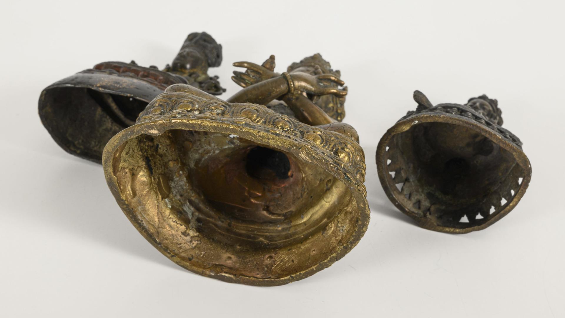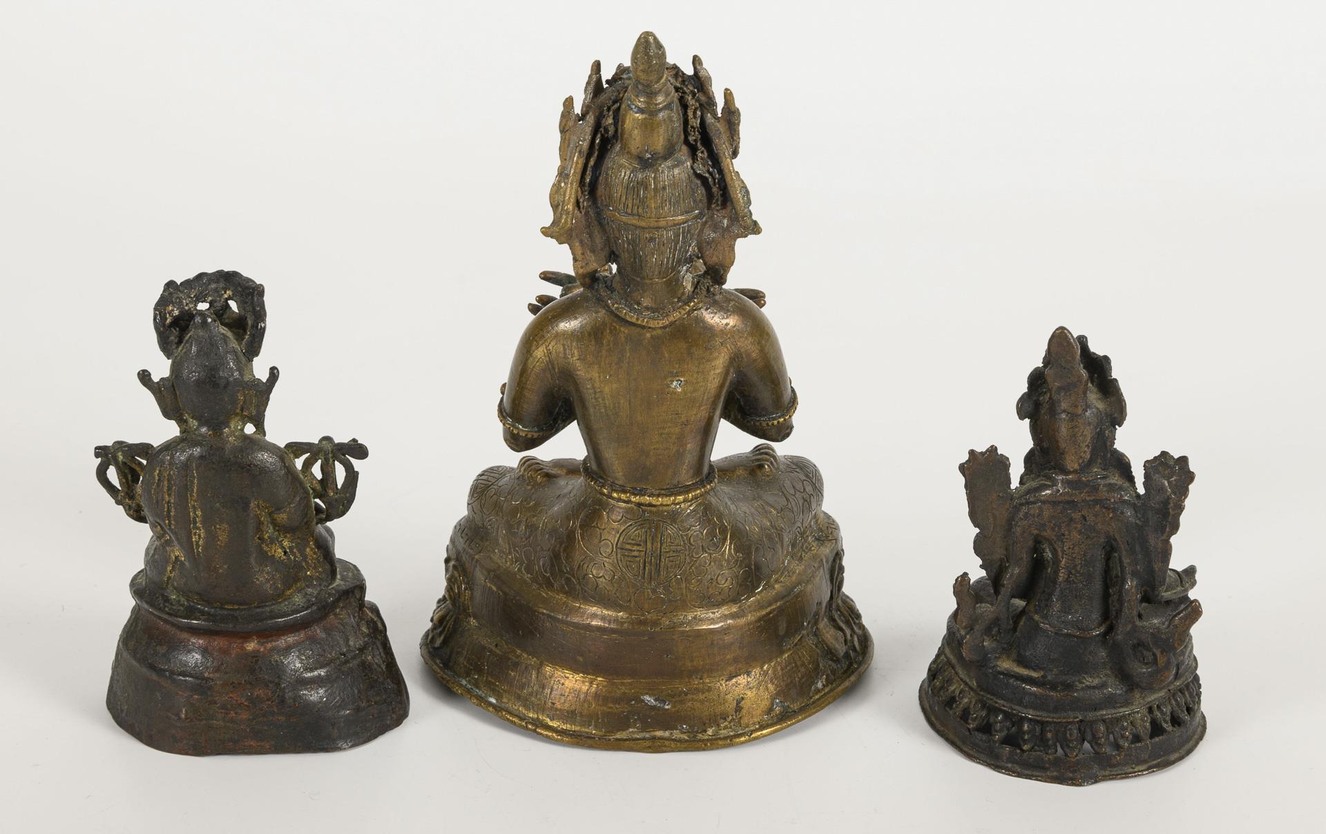 Larger figure seated, with crossed arms, holding a bell and vajra. (H 19 cm). / Small figure sitting loosely with lotus blossoms on the shoulders, dark patina. (H 12 cm). / Stylized figure seated, hands in meditation gesture, probably birds on the shoulders. (H 12 cm).