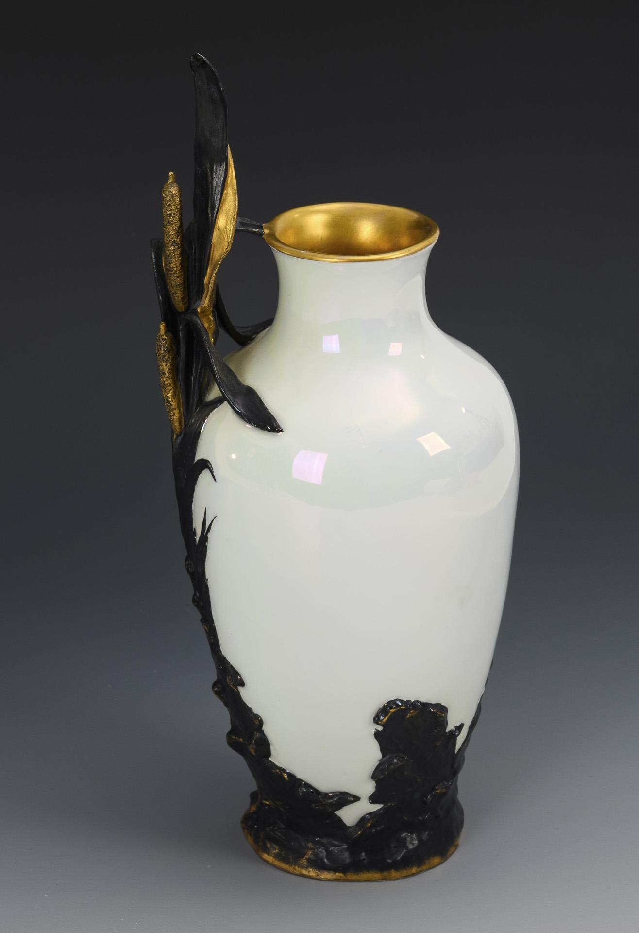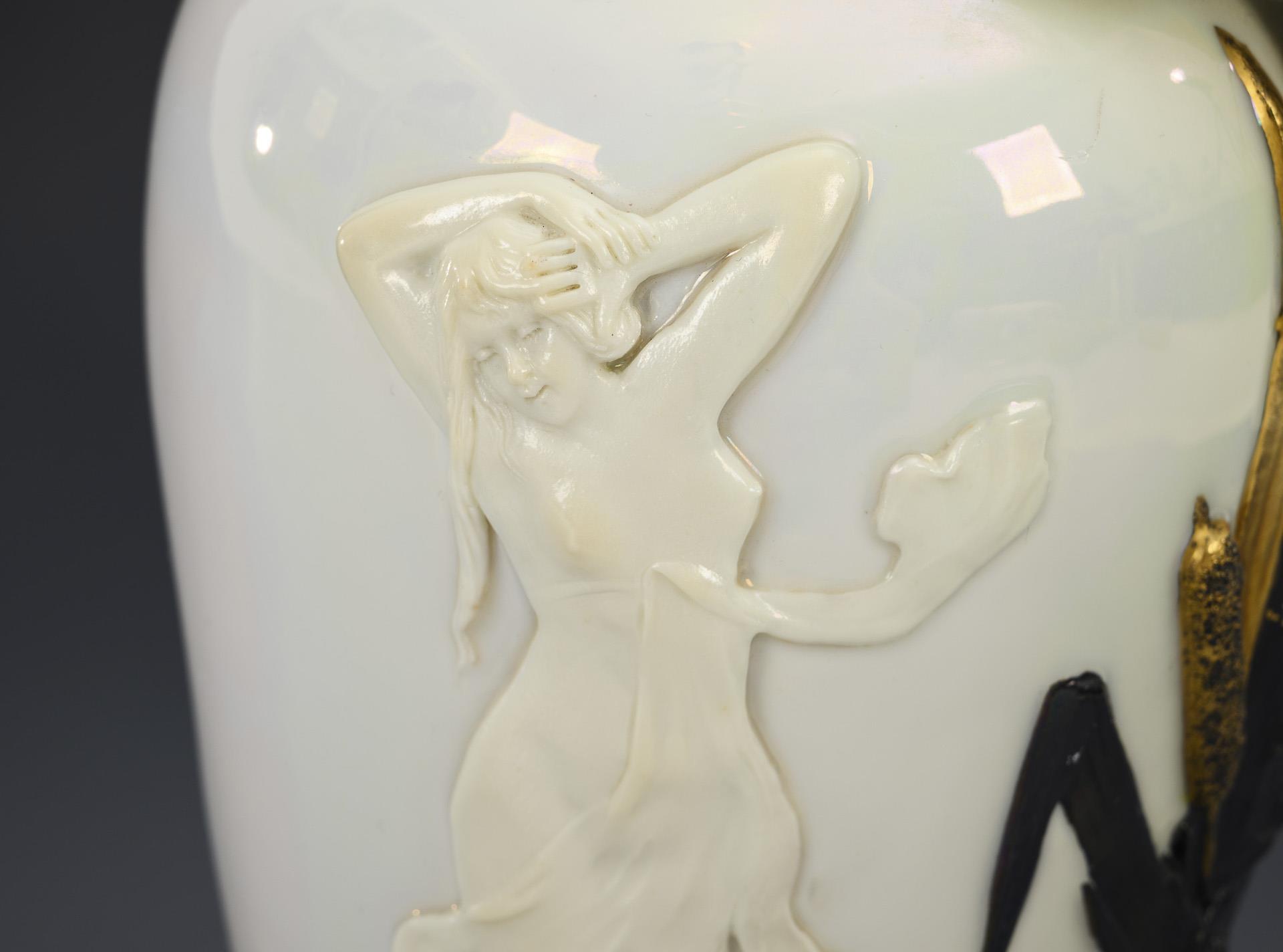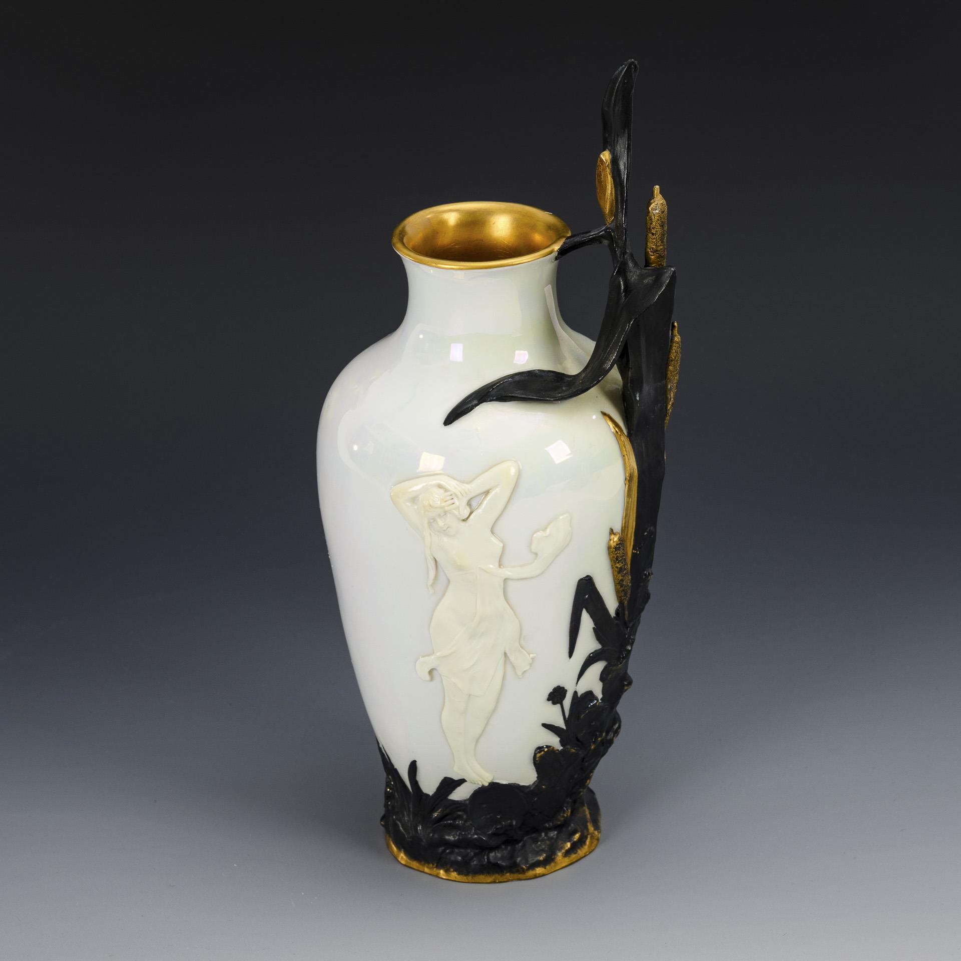 Baluster vase with reed handles and a relief of a nymph on the front.