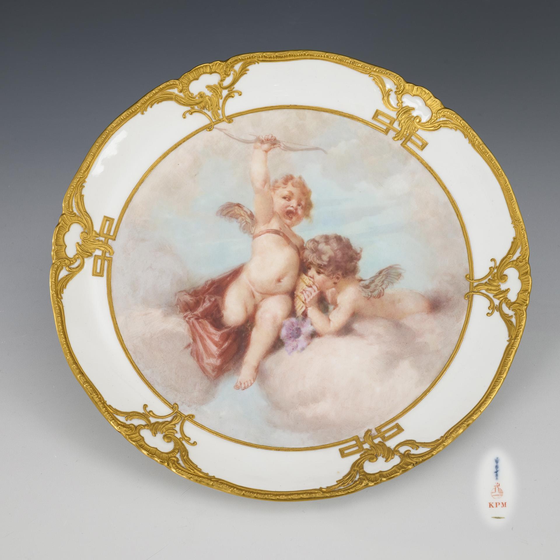 Plate with gilded rocaille edge, in the mirror the depiction of a pair of cupids on clouds.