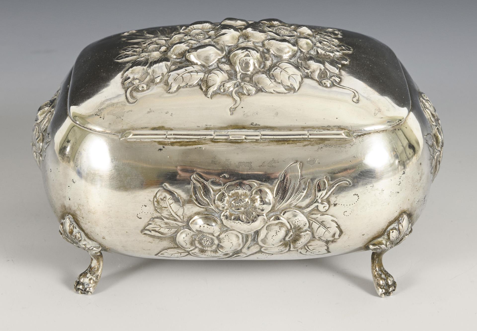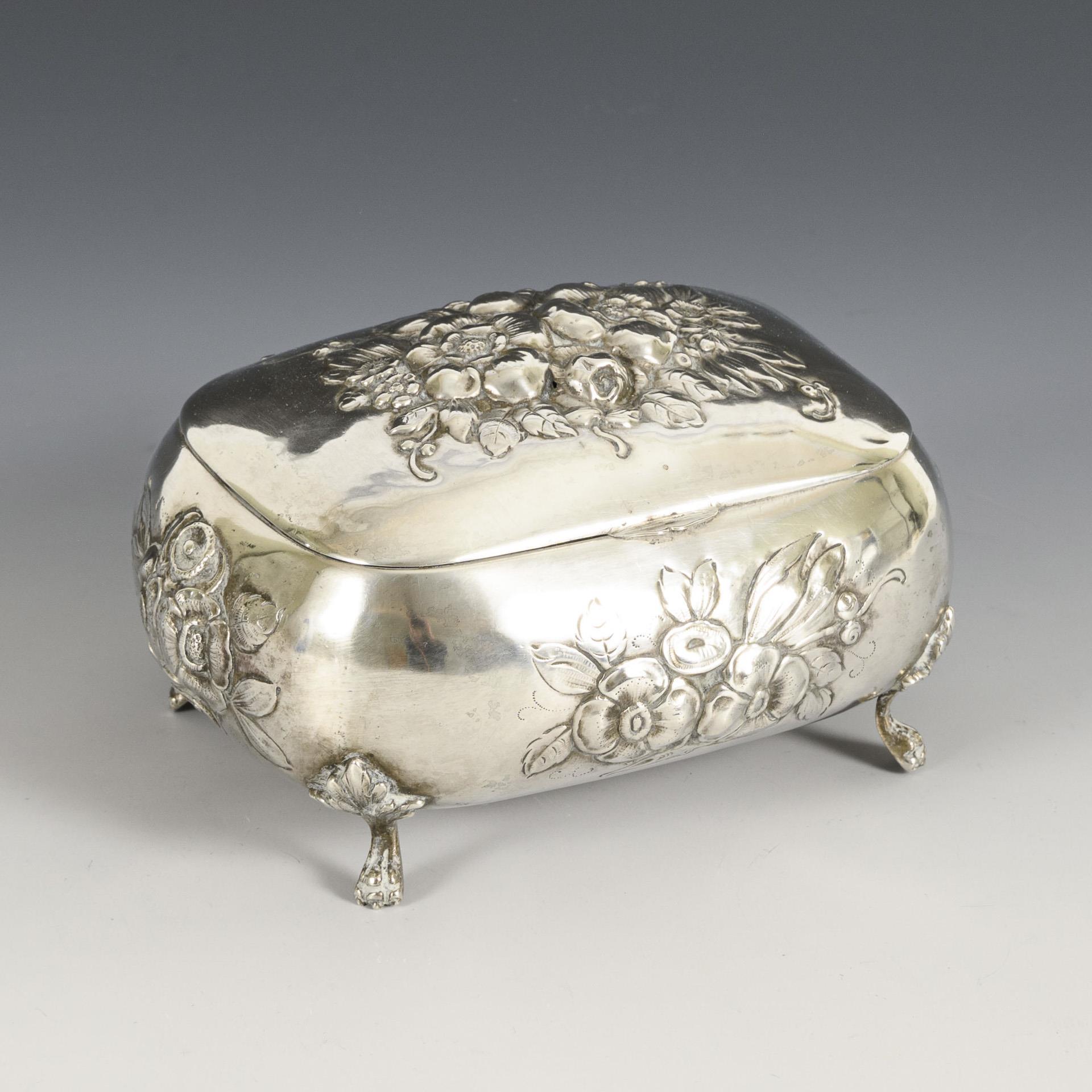 Rectangular, bulging box with hinged lid. Richly decorated with rose reliefs. Lid with tiny break and dent on the hinge.