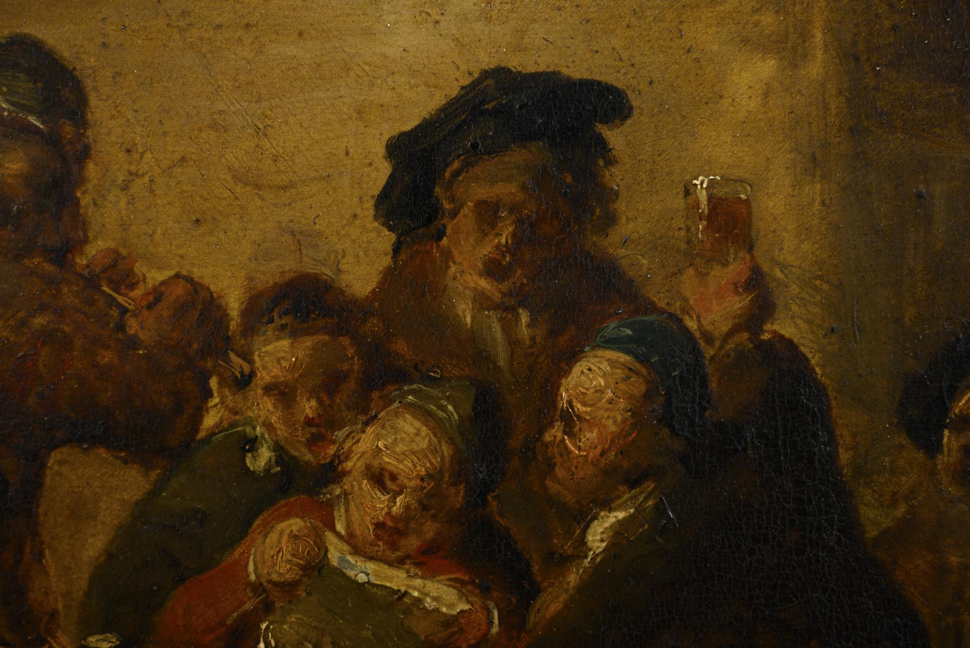 Scene painted in the manner of the Dutch Old Masters with men drinking at a table in the inn. Slight traces of age.
