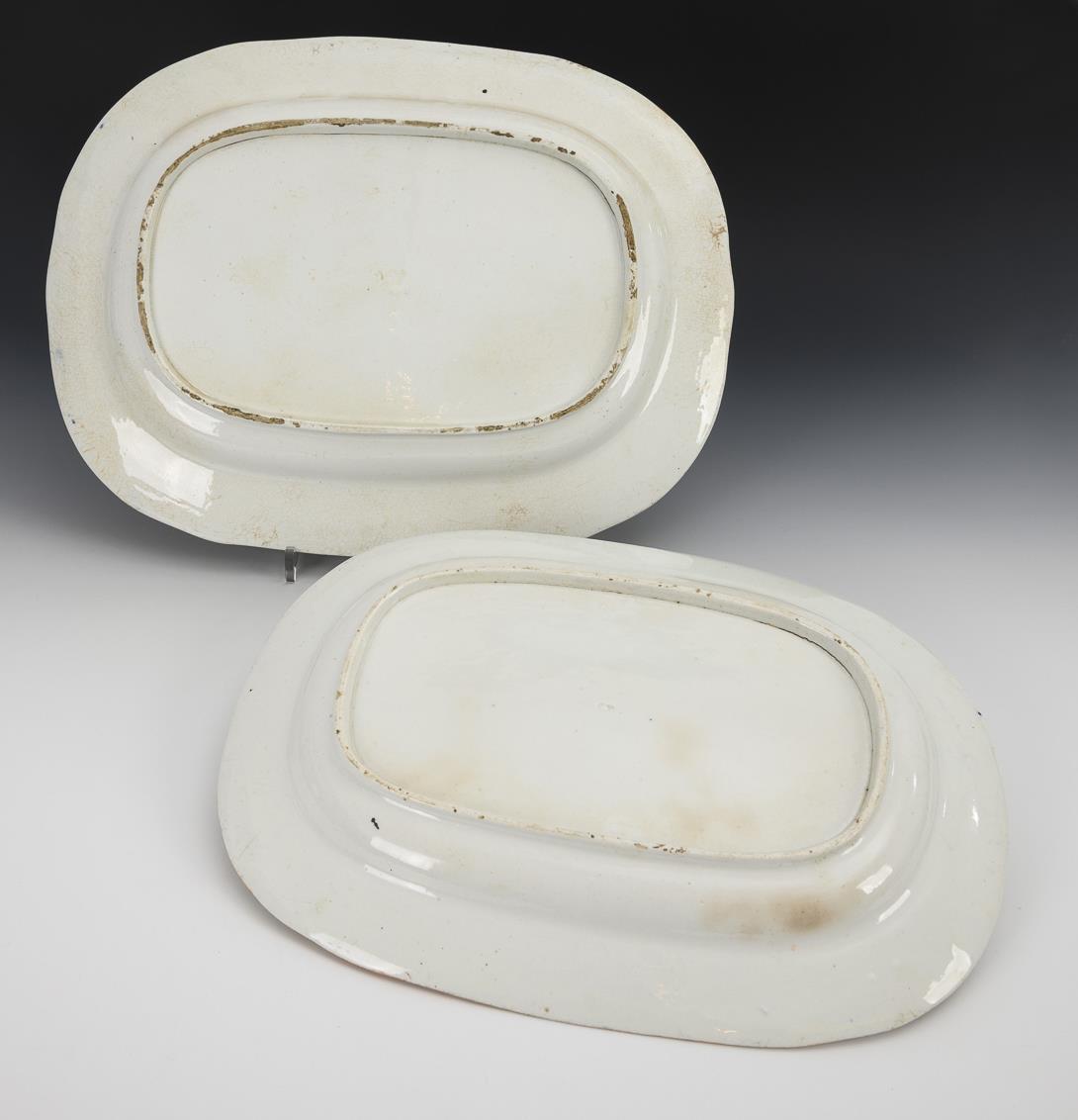 Oval-rectangular plates, slightly molded. Imari style decoration with tree stump and flowers. Signs of age, decoration and glaze rubbed.
