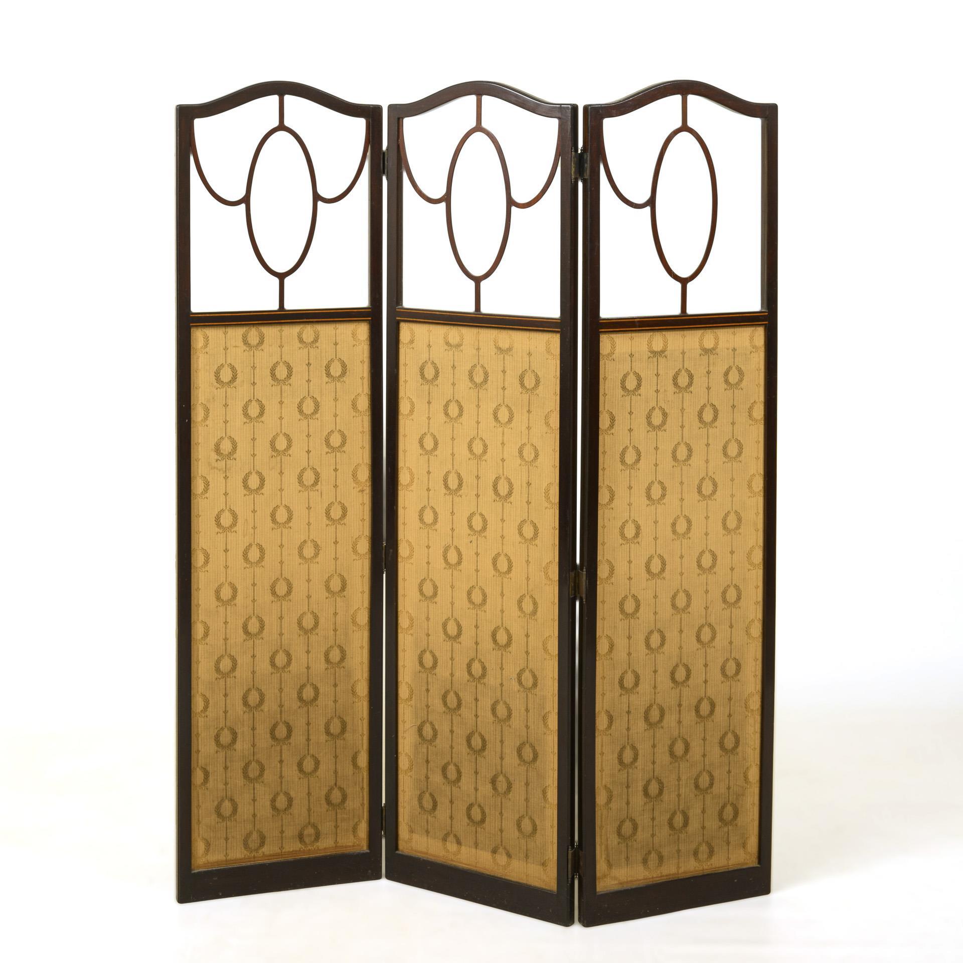 3-part partition wall with profile frame and curved upper ends, glazing with oval decorative segments in the upper third, lower section covered on both sides with ivory-colored fabric with wreath motifs. Brass hinges. Signs of age, 1 decorative strip in the glass missing, others partly loose or glued. Screen cannot be folded flat (at least 26 cm).