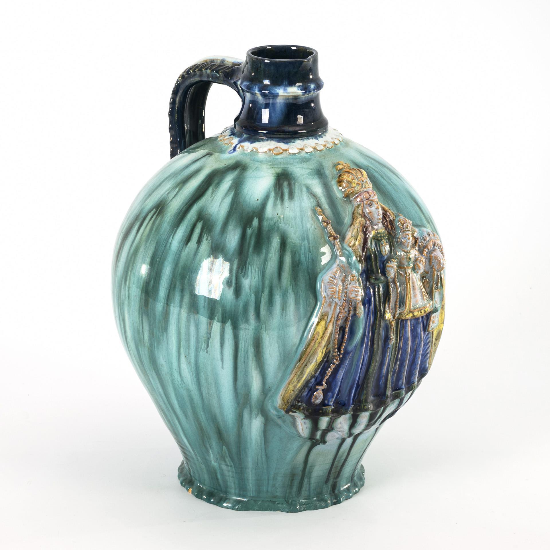 Historic faience jug with protective mantle Madonna. Münchener Werkstätten für Keramische Kunst.