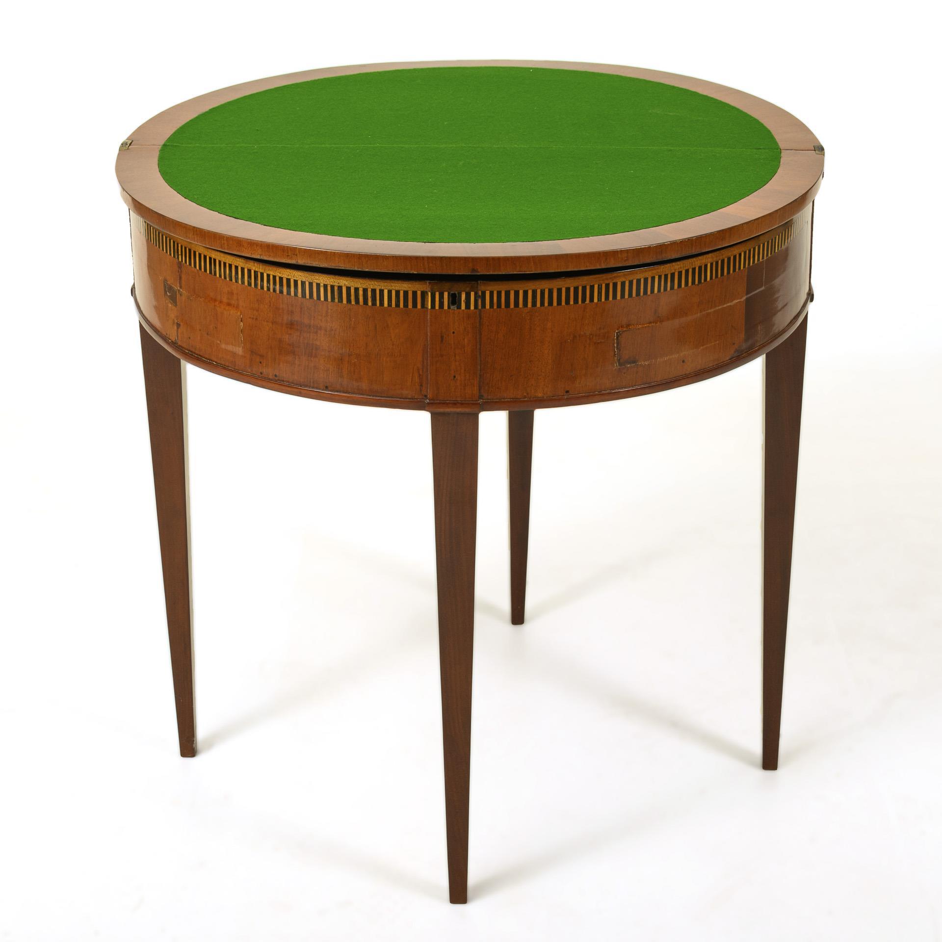 Semicircular console table with 3 hinged top panels and high frame compartment with black and white decorative frieze, on 4 tapered legs. Swivel support leg with 2 adjustable top supports as a storage aid for the hinged tops. Round playing surfaces with 1x chessboard marquetry and 1x green felt cover, 1x green felt cover on the semi-circular hinged lid above the frame compartment. Brass hinges. Originally lockable, here without lock and key. Restored, with additions and probably slight alterations, partial veneer defects.