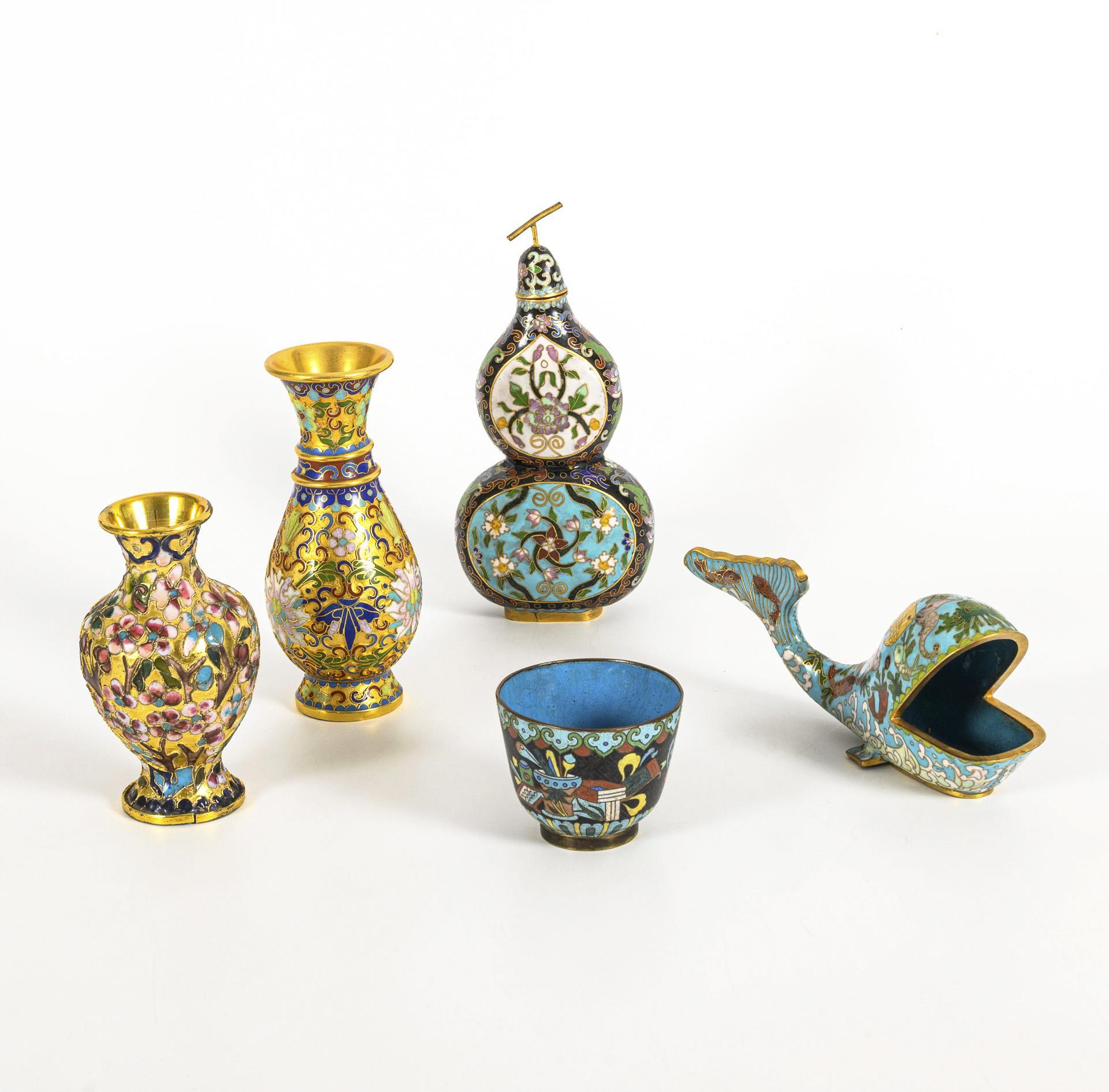 Two vases in Champlevé technique, a bottle, small bowl and fish with wide open mouth. One vase with 'center seam'; small bowl with chip inside.